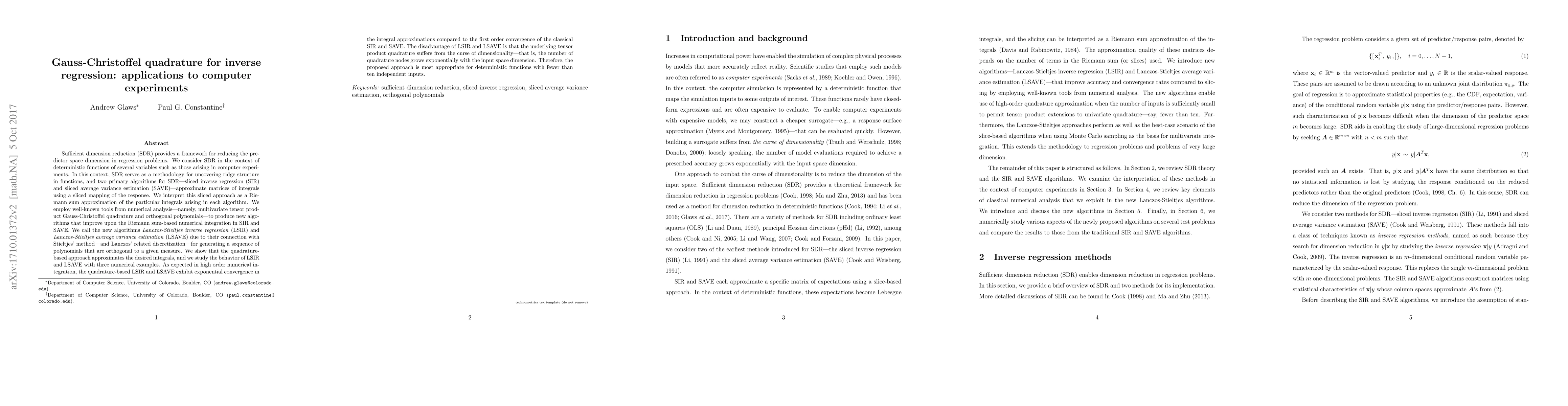 This research introduces Lanczos-Stieltjes inverse regression (LSIR) and Lanczos-Stieltjes average variance estimation (LSAVE) algorithms for improving numerical integration in sufficient dimension reduction (SDR) for computer experiments. These new methods, based on Gauss-Christoffel quadrature and orthogonal polynomials, exhibit exponential convergence compared to the linear convergence of classical SIR and SAVE algorithms. However, they suffer from the curse of dimensionality, making them most suitable for functions with fewer than ten independent inputs.