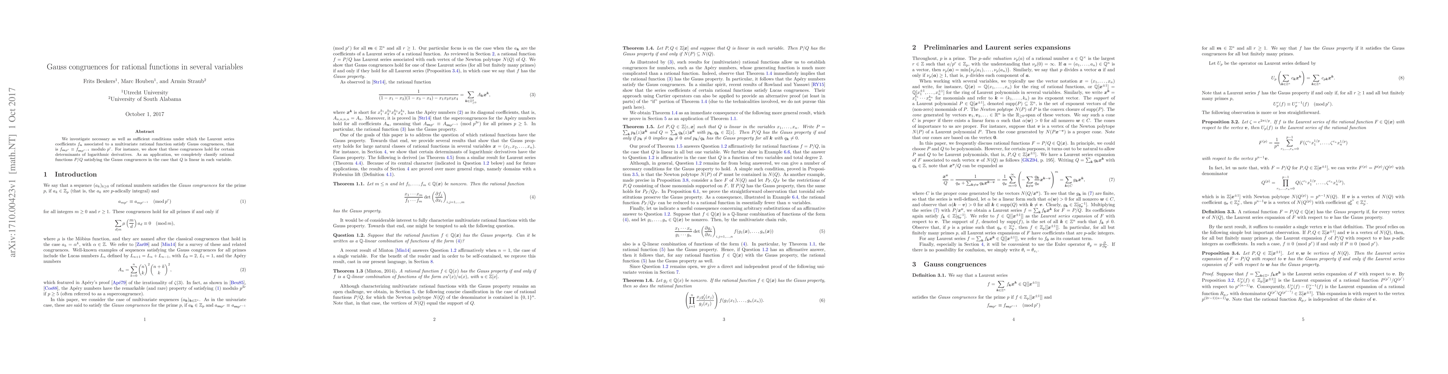 This research paper investigates conditions for the coefficients of multivariate rational functions to satisfy Gauss congruences, a tool for classifying certain types of rational functions.