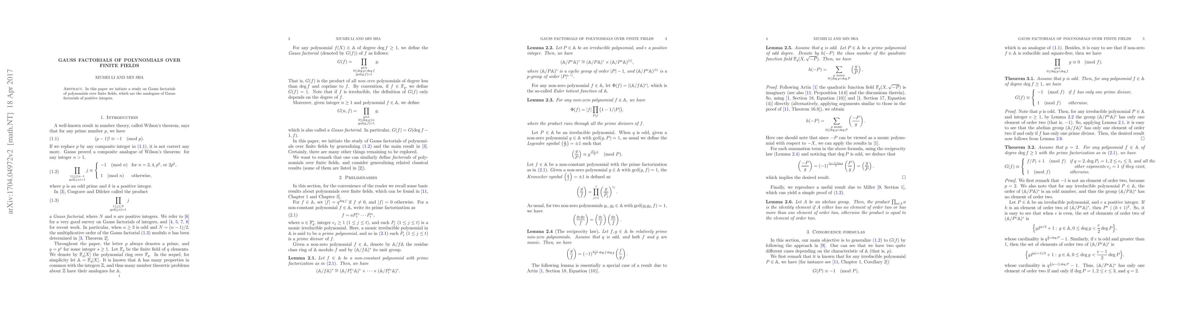 Summary: This paper explores Gauss factorials of polynomials defined over finite fields, establishing their properties as analogues to the Gauss factorials of positive integers. The study aims to understand these polynomial analogues in the context of finite field arithmetic.
