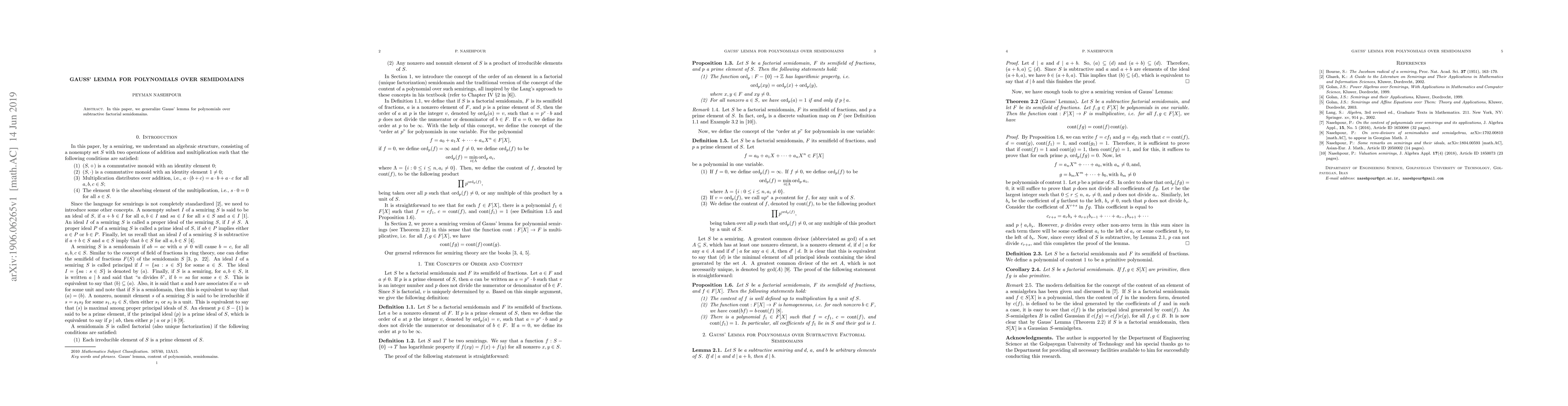 This paper extends Gauss' lemma, applicable to polynomials over subtractive factorial semidomains, providing a broader context for understanding polynomial behavior in algebraic structures beyond integral domains.