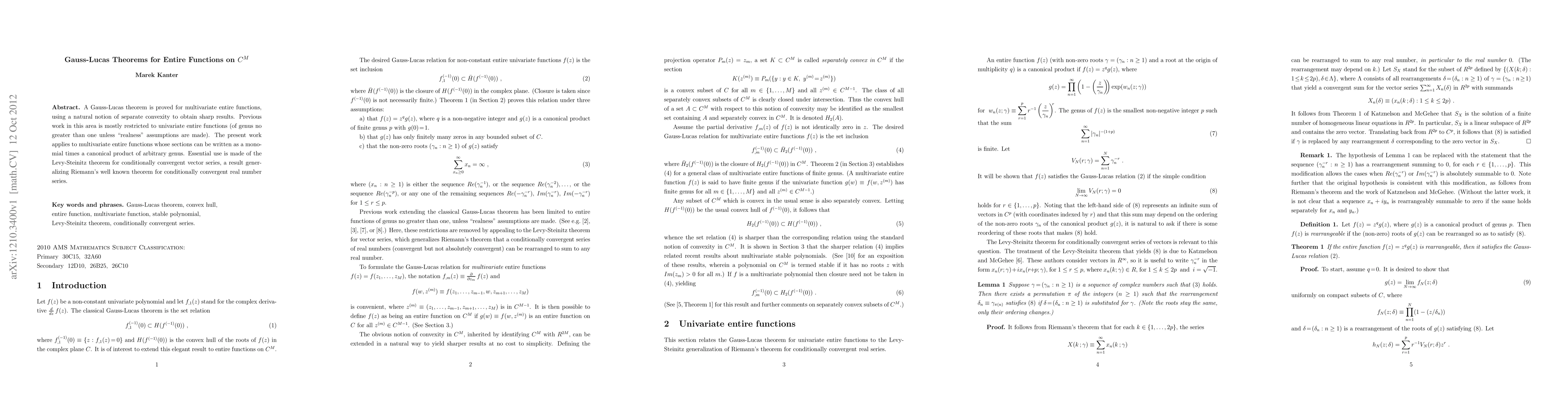 A Gauss-Lucas theorem is proved for multivariate entire functions, using a natural notion of separate convexity to obtain sharp results. Previous work in this area is mostly restricted to univariate entire functions (of genus no greater than one unless "realness" assumptions are made.) The present work applies to multivariate entire functions whose one dimensional sections can be written as a monomial times a canonical product of arbitrary genus. Essential use is made of the Levy-Steinitz theorem for conditionally convergent real number series.