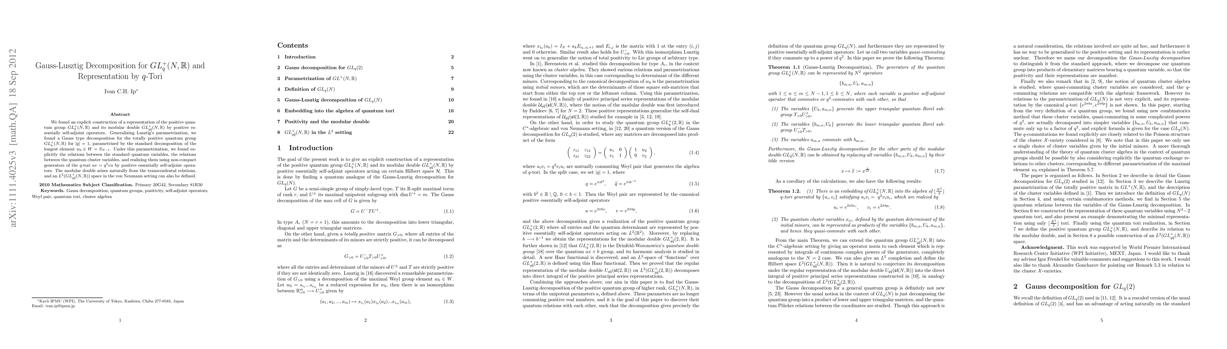 This paper constructs representations of the positive quantum group $GL_q^+(N,\R)$ and its modular double using positive essentially self-adjoint operators, generalizing Lusztig's parametrization. It provides a Gauss-Lusztig decomposition for $GL_q^+(N,\R)$ when $|q|=1$, establishing explicit relations between quantum variables and realizing them via non-compact generators of $q$-tori.