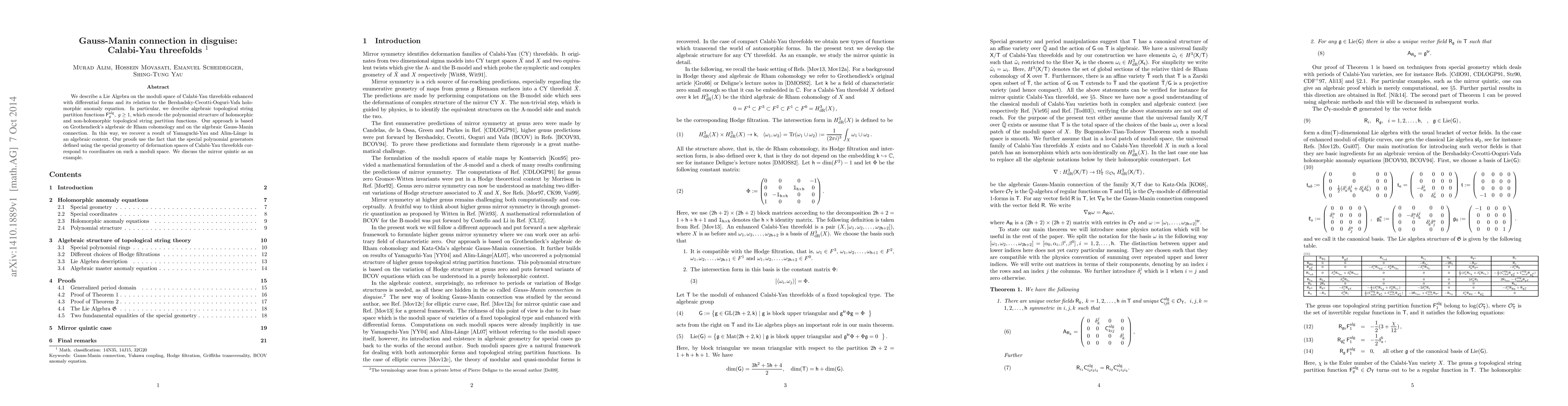 This paper explores a Lie algebra on the moduli space of Calabi-Yau threefolds, enhanced with differential forms, and its connection to the Bershadsky-Cecotti-Ooguri-Vafa holomorphic anomaly equation. It utilizes Grothendieck's algebraic de Rham cohomology and the algebraic Gauss-Manin connection to recover results from Yamaguchi-Yau and Alim-Länge in an algebraic framework, with the mirror quintic serving as an illustrative example.