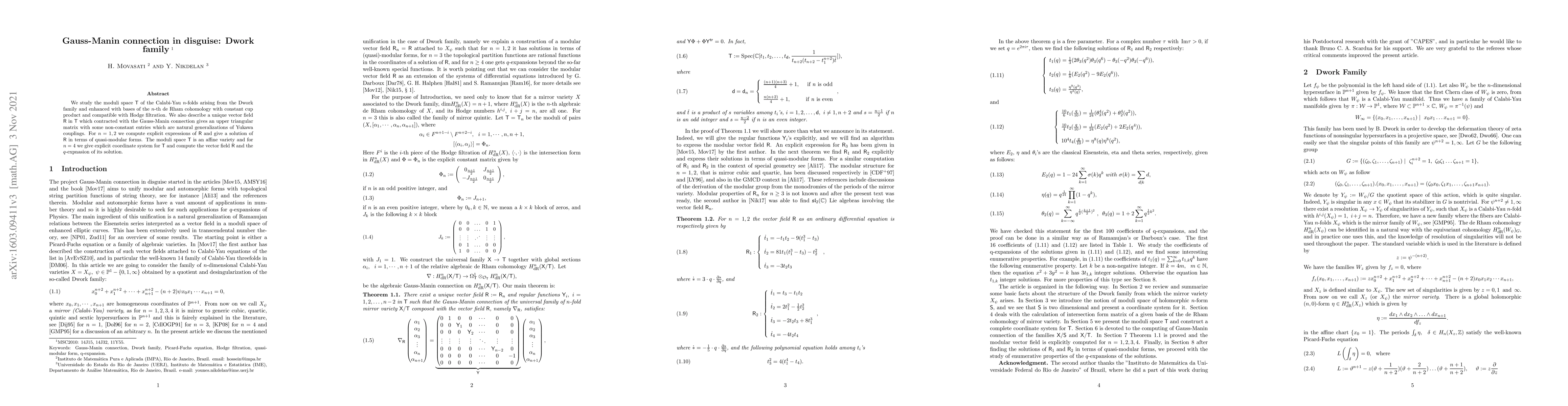 This paper investigates the moduli space of Calabi-Yau $n$-folds from the Dwork family, enhanced with specific bases of $n$-th de Rham cohomology. It identifies a unique vector field $\textsf{R}$ whose contraction with the Gauss-Manin connection yields an upper triangular matrix, generalizing Yukawa couplings, and computes explicit expressions for $\textsf{R}$ for $n=1,2$ in terms of quasi-modular forms.