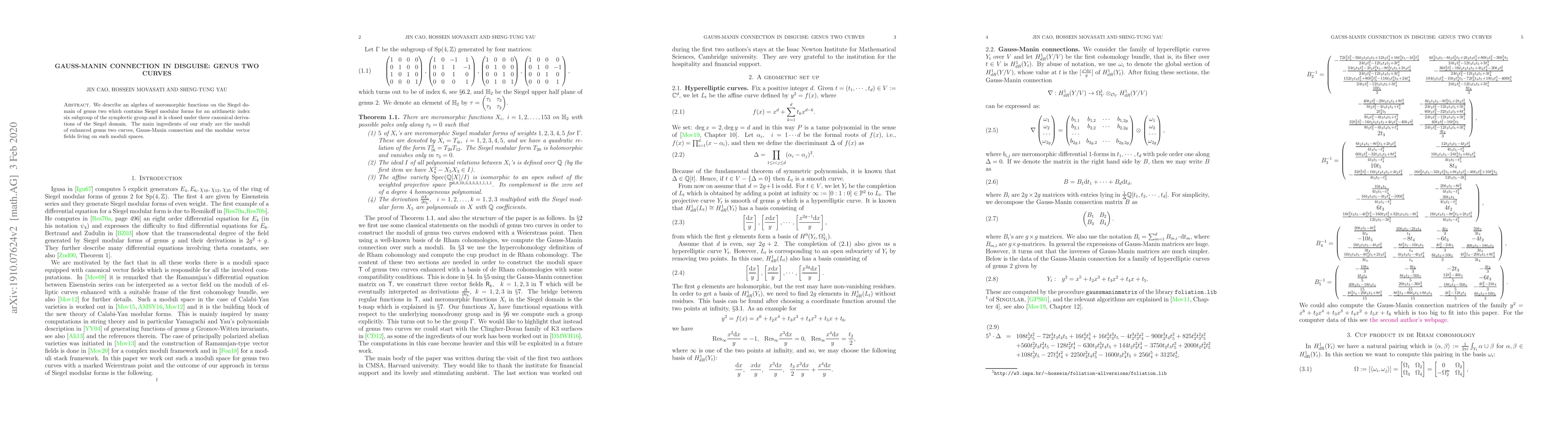 This paper explores an algebra of meromorphic functions on the Siegel domain for genus two curves, revealing Siegel modular forms linked to an arithmetic subgroup of the symplectic group. It utilizes the Gauss-Manin connection and modular vector fields to study these functions and their derivations.