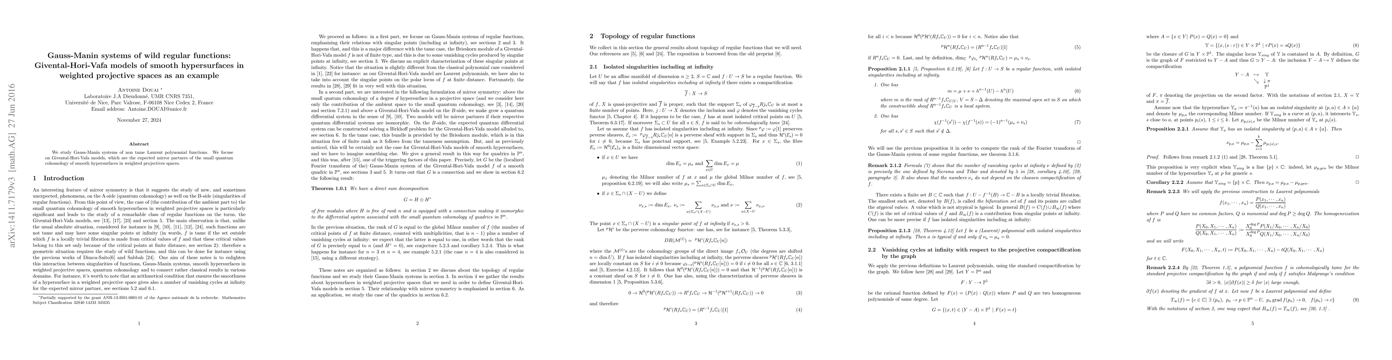 This paper investigates Gauss-Manin systems associated with wild regular functions, specifically focusing on Hori-Vafa models for smooth hypersurfaces in weighted projective spaces as examples of expected mirror partners of small quantum cohomology.