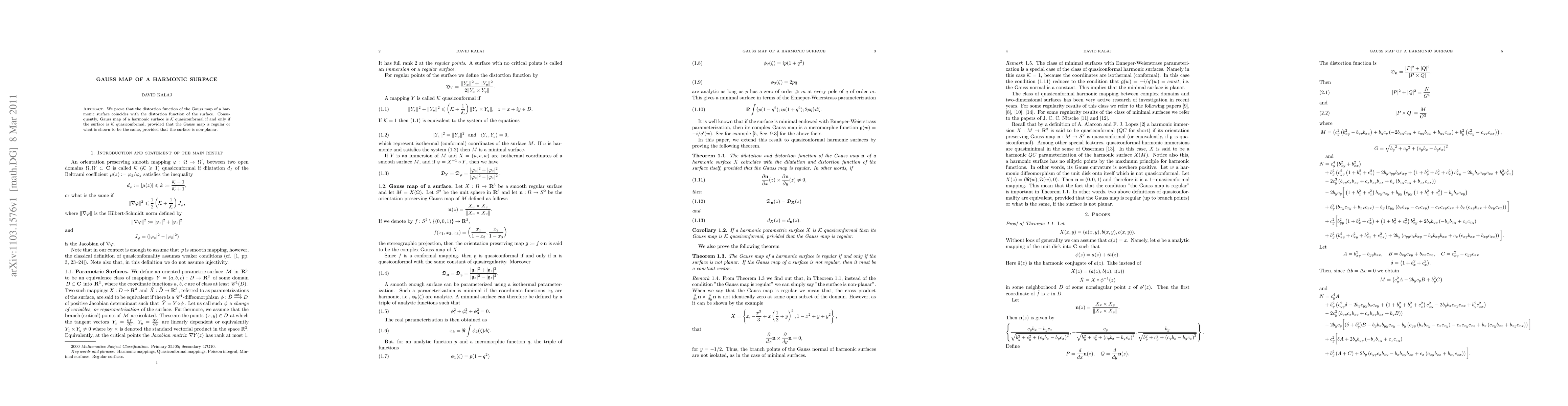 The paper shows that the Gauss map of a harmonic surface has the same distortion function as the surface itself, linking their quasiregularity properties.