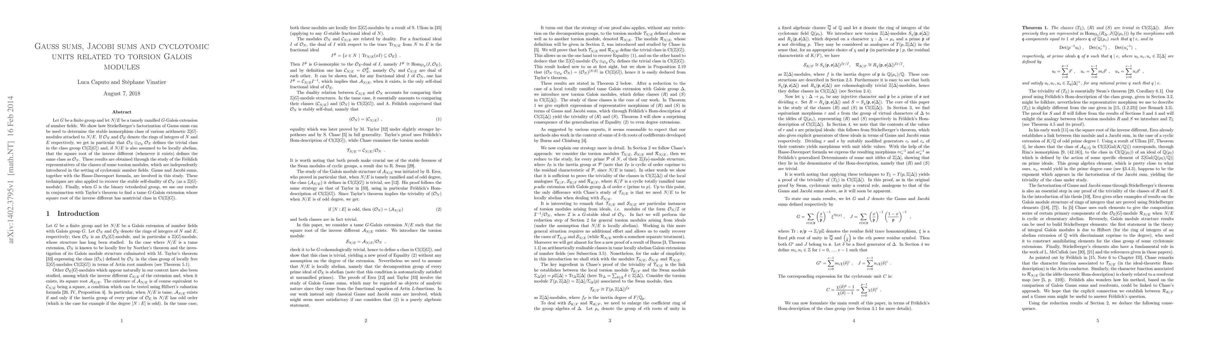 Let $G$ be a finite group and let $N/E$ be a tamely ramified $G$-Galois extension of number fields. We show how Stickelberger's factorization of Gauss sums can be used to determine the stable isomorphism class of various arithmetic $\mathbb{Z}[G]$-modules attached to $N/E$. If $\mathcal{O}_N$ and $\mathcal{O}_E$ denote the rings of integers of $N$ and $E$ respectively, we get in particular that $\mathcal{O}_N\otimes_{\mathcal{O}_E}\mathcal{O}_N$ defines the trivial class in the class group $\mathrm{Cl}(\mathbb{Z}[G])$ and, if $N/E$ is also assumed to be locally abelian, that the square root of the inverse different (whenever it exists) defines the same class as $\mathcal{O}_N$. These results are obtained through the study of the Fr\"ohlich representatives of the classes of some torsion modules, which are independently introduced in the setting of cyclotomic number fields. Gauss and Jacobi sums, together with the Hasse-Davenport formula, are involved in this study. These techniques are also applied to recover the stable self-duality of $\mathcal{O}_N$ (as a $\mathbb{Z}[G]$-module). Finally, when $G$ is the binary tetrahedral group, we use our results in conjunction with Taylor's theorem to find a tame $G$-Galois extension whose square root of the inverse different has nontrivial class in $\mathrm{Cl}(\mathbb{Z}[G])$.