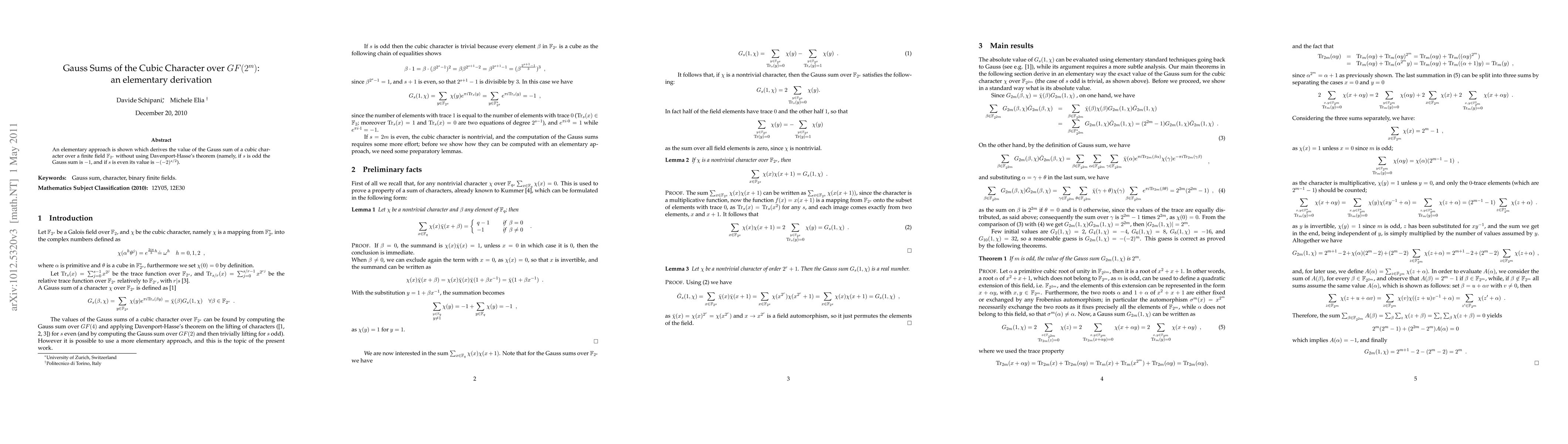 Summary: This paper presents a straightforward derivation for the Gauss sum of a cubic character over the finite field $\mathbb F_{2^s}$, providing results without relying on Davenport-Hasse's theorem, determining the sum to be -1 when $s$ is odd and $-(-2)^{s/2}$ when $s$ is even.