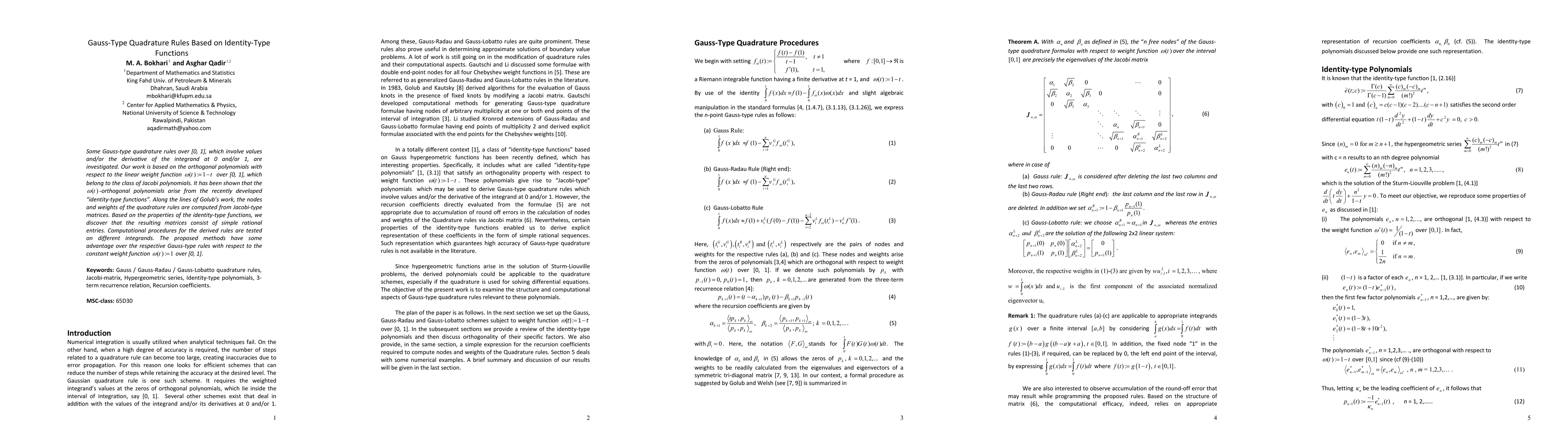 Summary: This paper explores Gauss-type quadrature rules over the interval [0, 1] that incorporate values and/or derivatives of the integrand at the endpoints, aiming to enhance numerical integration accuracy. The study focuses on the development and analysis of these identity-type functions.