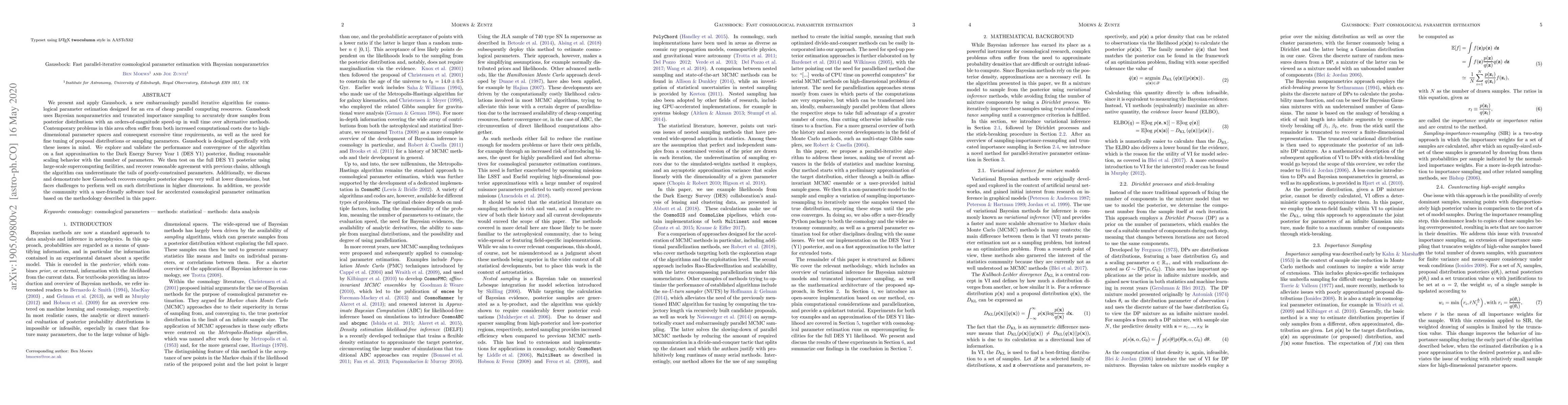 Gaussbock is an efficient parallel-iterative algorithm for cosmological parameter estimation using Bayesian nonparametrics, achieving significant speed-ups over traditional methods. It demonstrates good performance on lower-dimensional posteriors but faces challenges in higher dimensions, while providing a user-friendly tool for the research community.