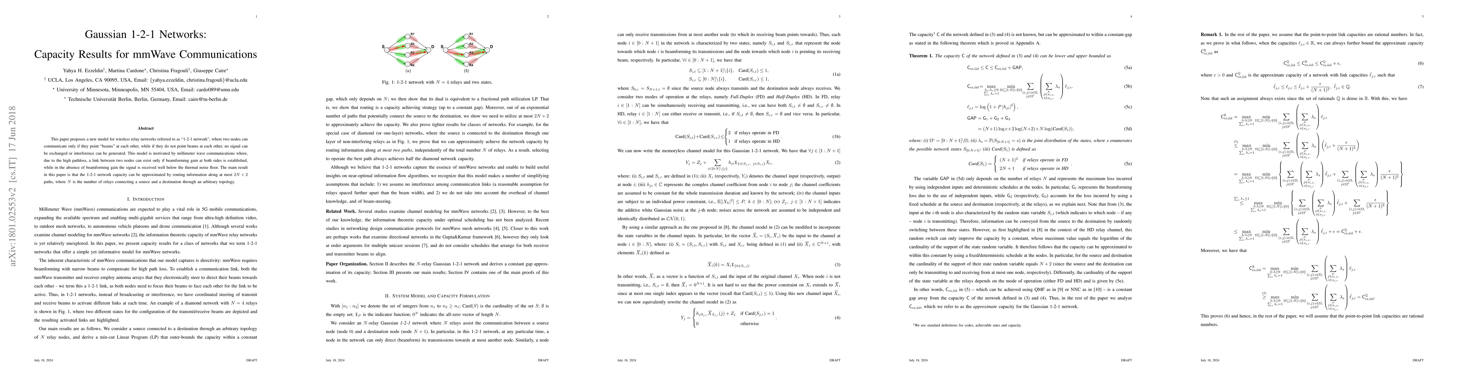 This paper proposes a new model for wireless relay networks referred to as "1-2-1 network", where two nodes can communicate only if they point "beams" at each other, while if they do not point beams at each other, no signal can be exchanged or interference can be generated. This model is motivated by millimeter wave communications where, due to the high path loss, a link between two nodes can exist only if beamforming gain at both sides is established, while in the absence of beamforming gain the signal is received well below the thermal noise floor. The main result in this paper is that the 1-2-1 network capacity can be approximated by routing information along at most $2N+2$ paths, where $N$ is the number of relays connecting a source and a destination through an arbitrary topology.