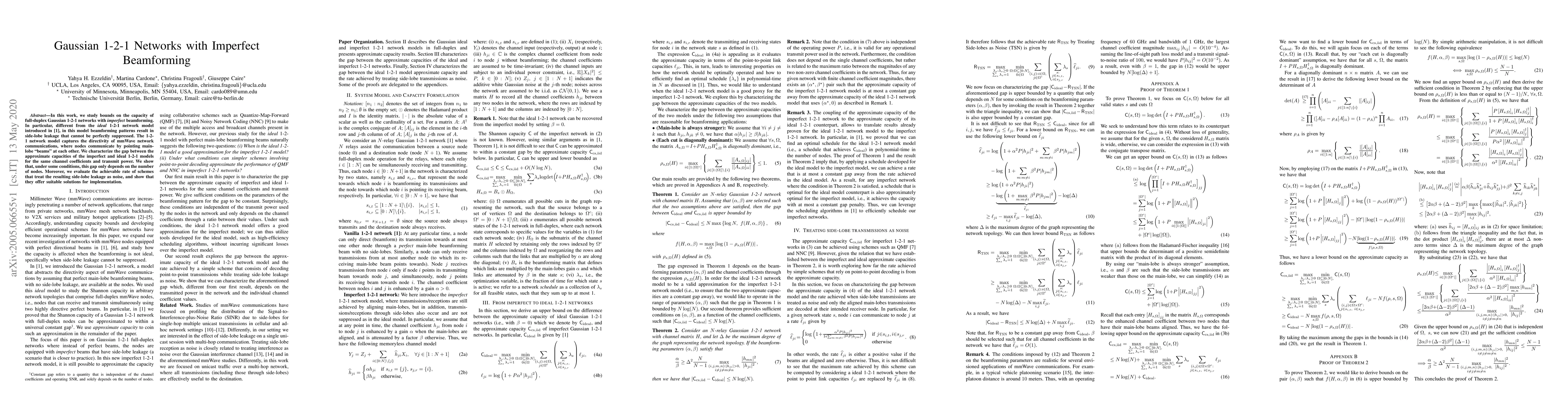 In this work, we study bounds on the capacity of full-duplex Gaussian 1-2-1 networks with imperfect beamforming. In particular, different from the ideal 1-2-1 network model introduced in [1], in this model beamforming patterns result in side-lobe leakage that cannot be perfectly suppressed. The 1-2-1 network model captures the directivity of mmWave network communications, where nodes communicate by pointing main-lobe "beams" at each other. We characterize the gap between the approximate capacities of the imperfect and ideal 1-2-1 models for the same channel coefficients and transmit power. We show that, under some conditions, this gap only depends on the number of nodes. Moreover, we evaluate the achievable rate of schemes that treat the resulting side-lobe leakage as noise, and show that they offer suitable solutions for implementation.