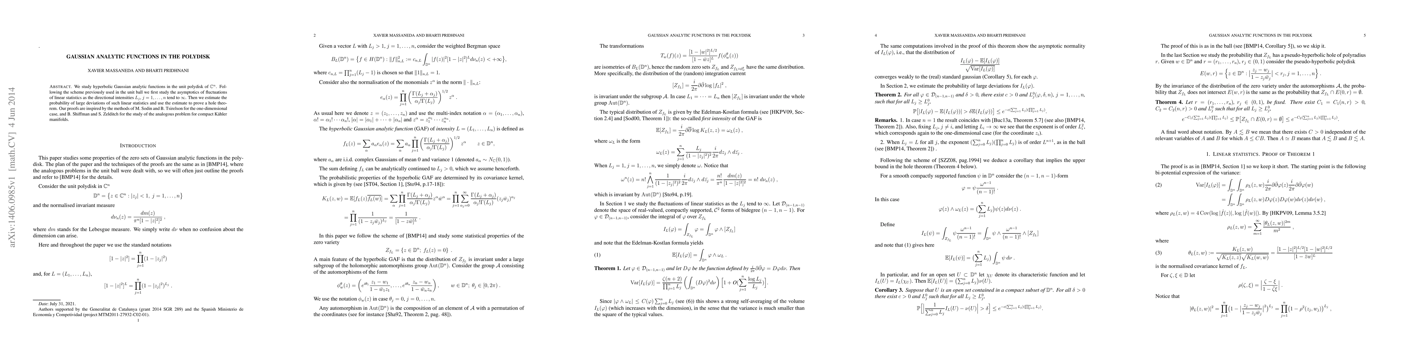 This paper studies Gaussian analytic functions in the unit polydisk of ∜^n, focusing on asymptotics of fluctuations and probability of large deviations, leading to a hole theorem.