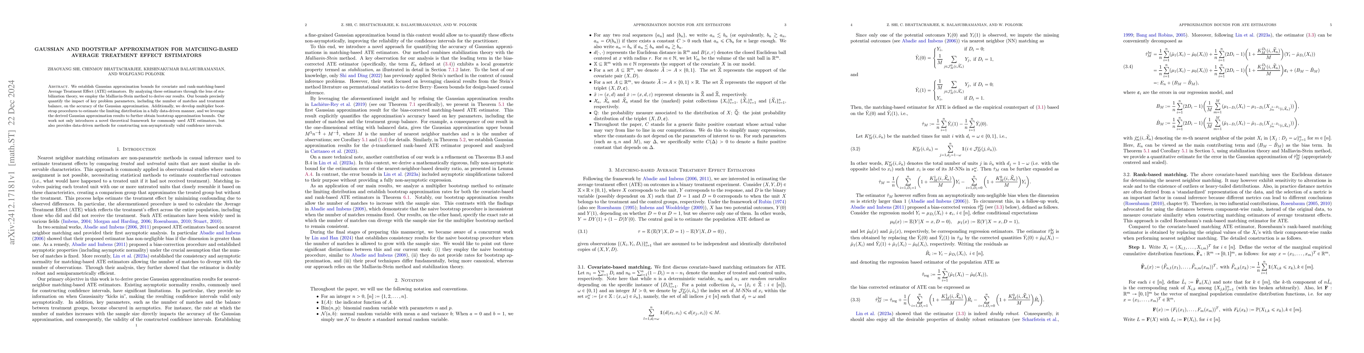 We establish Gaussian approximation bounds for covariate and rank-matching-based Average Treatment Effect (ATE) estimators. By analyzing these estimators through the lens of stabilization theory, we employ the Malliavin-Stein method to derive our results. Our bounds precisely quantify the impact of key problem parameters, including the number of matches and treatment balance, on the accuracy of the Gaussian approximation. Additionally, we develop multiplier bootstrap procedures to estimate the limiting distribution in a fully data-driven manner, and we leverage the derived Gaussian approximation results to further obtain bootstrap approximation bounds. Our work not only introduces a novel theoretical framework for commonly used ATE estimators, but also provides data-driven methods for constructing non-asymptotically valid confidence intervals.