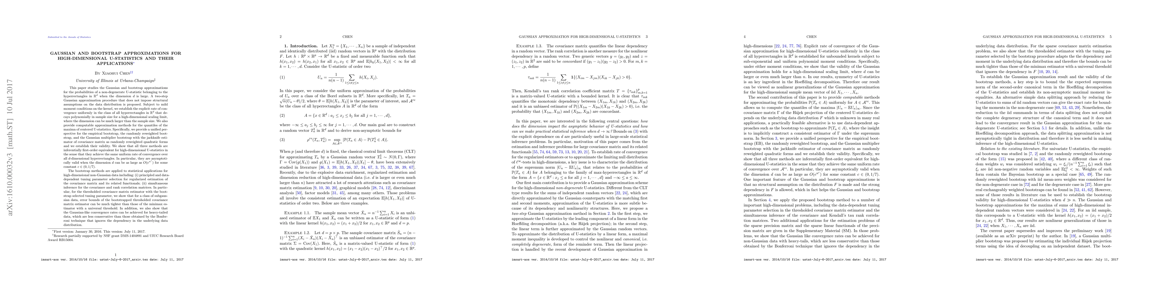 This paper proposes a Gaussian approximation method for high-dimensional U-statistics and establishes its convergence rate, demonstrating that it works without structural assumptions on the data distribution. It also shows the equivalence of various bootstrap methods for approximating the quantiles of U-statistics in high dimensions.