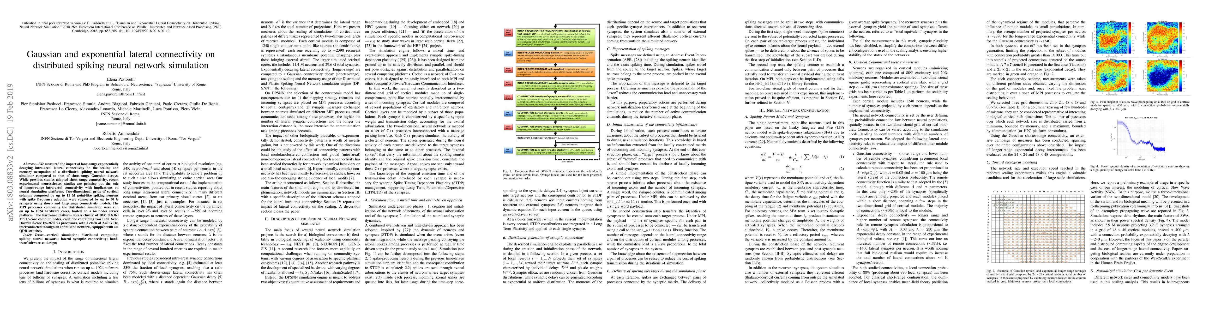 A distributed spiking neural network simulator was used to compare the impact of short-range Gaussian connectivity versus long-range exponentially decaying intra-areal connectivity on scaling and memory occupation. Long-range connectivity outperformed short-range connectivity in terms of simulation speed and efficiency.