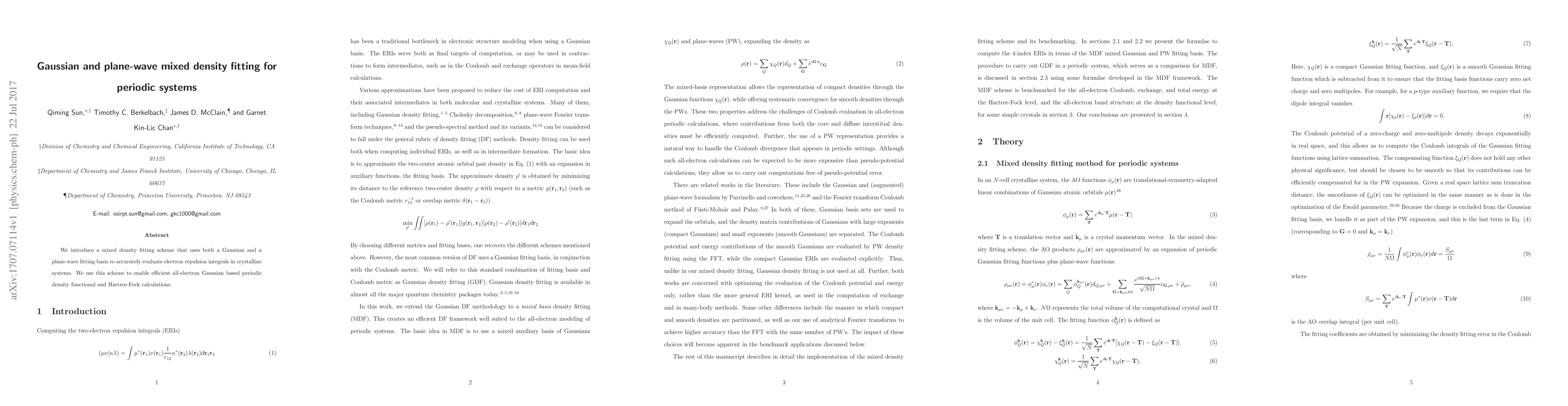 This paper proposes a mixed density fitting method combining Gaussian and plane-wave bases to efficiently compute electron repulsion integrals in periodic systems, enabling effective all-electron calculations for density functional and Hartree-Fock theories. The approach enhances computational efficiency while maintaining accuracy.