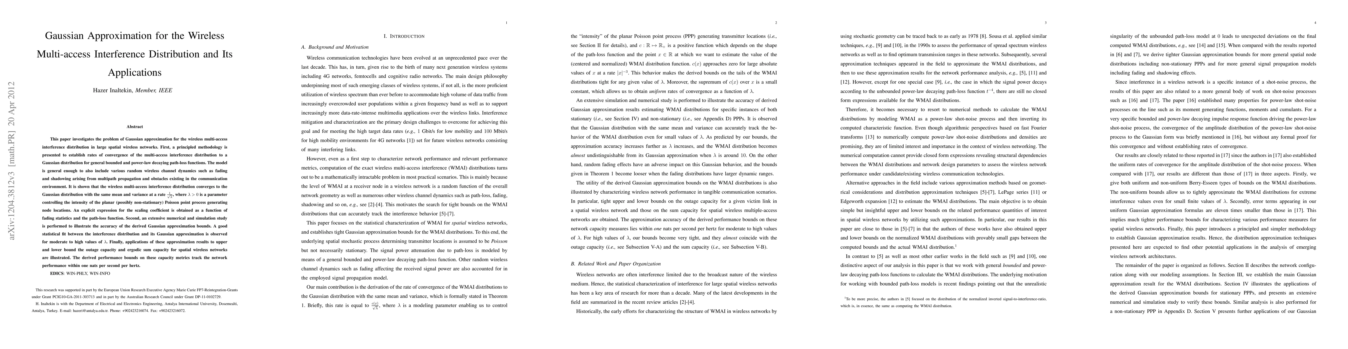 This paper investigates the problem of Gaussian approximation for the wireless multi-access interference distribution in large spatial wireless networks. First, a principled methodology is presented to establish rates of convergence of the multi-access interference distribution to a Gaussian distribution for general bounded and power-law decaying path-loss functions. The model is general enough to also include various random wireless channel dynamics such as fading and shadowing arising from multipath propagation and obstacles existing in the communication environment. It is shown that the wireless multi-access interference distribution converges to the Gaussian distribution with the same mean and variance at a rate $\frac{1}{\sqrt{\lambda}}$, where $\lambda>0$ is a parameter controlling the intensity of the planar (possibly non-stationary) Poisson point process generating node locations. An explicit expression for the scaling coefficient is obtained as a function of fading statistics and the path-loss function. Second, an extensive numerical and simulation study is performed to illustrate the accuracy of the derived Gaussian approximation bounds. A good statistical fit between the interference distribution and its Gaussian approximation is observed for moderate to high values of $\lambda$. Finally, applications of these approximation results to upper and lower bound the outage capacity and ergodic sum capacity for spatial wireless networks are illustrated. The derived performance bounds on these capacity metrics track the network performance within one nats per second per hertz.