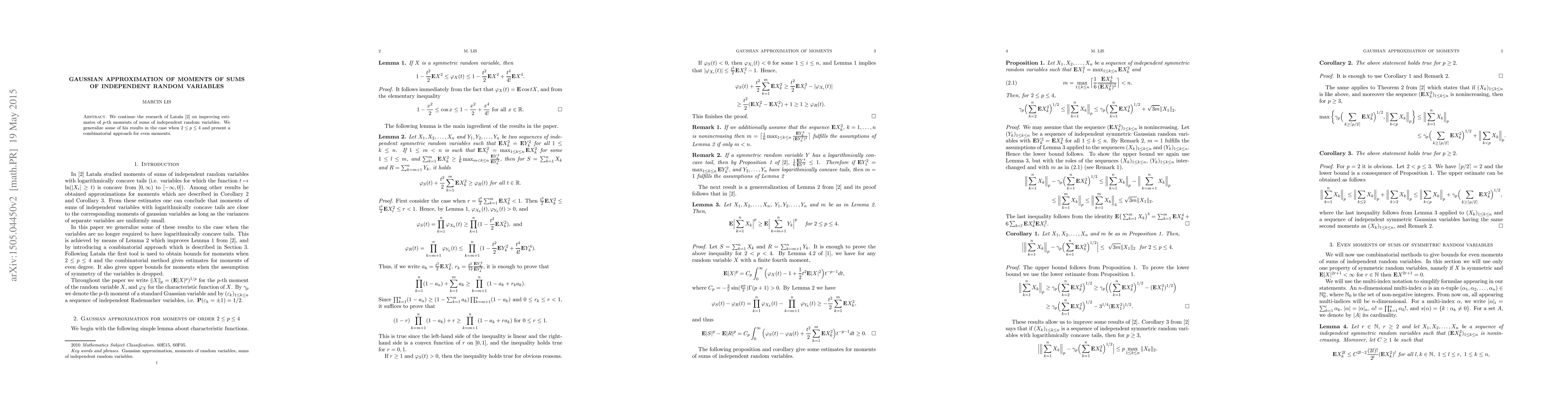 Summary: This paper extends Latała's work on estimating $p$-th moments of sums of independent random variables, specifically improving results for $2 \leq p \leq 4$ and introducing a combinatorial method for even moments. The focus is on Gaussian approximation techniques.