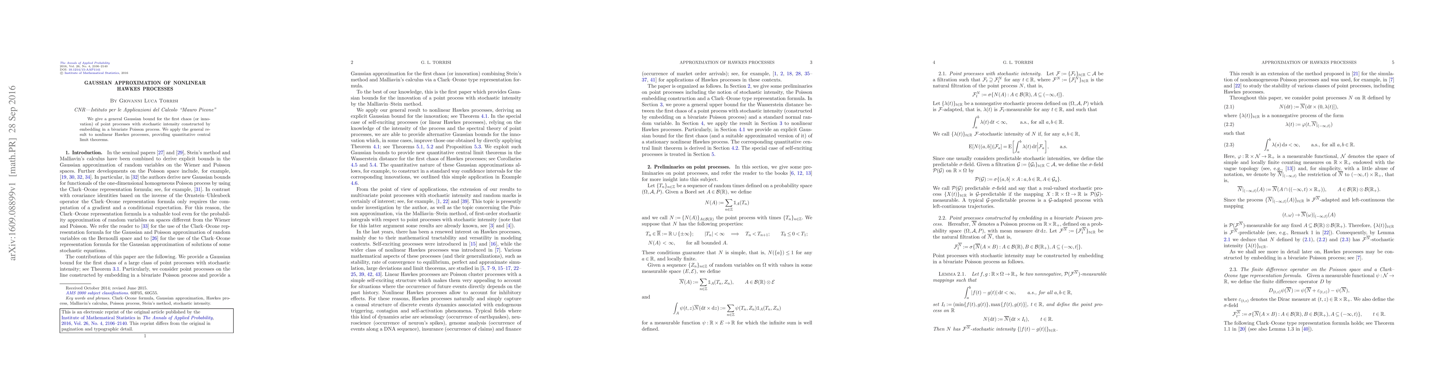 We give a general Gaussian bound for the first chaos (or innovation) of point processes with stochastic intensity constructed by embedding in a bivariate Poisson process. We apply the general result to nonlinear Hawkes processes, providing quantitative central limit theorems.