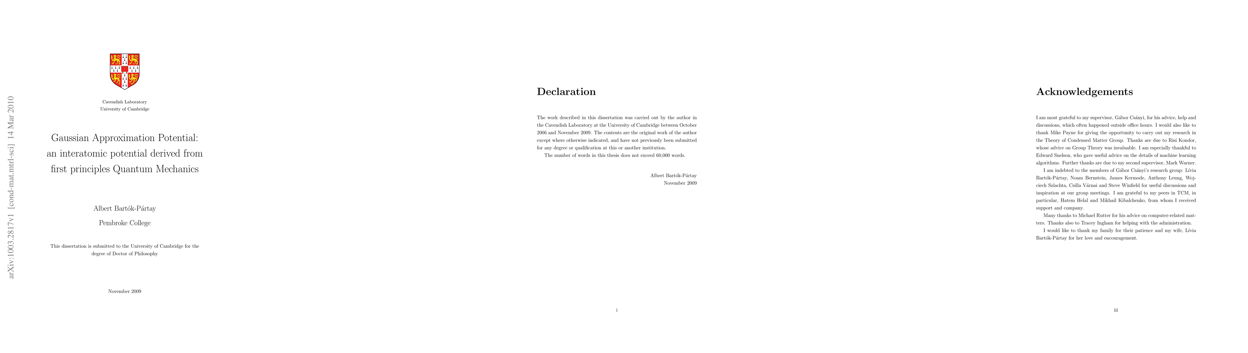 Simulation of materials at the atomistic level is an important tool in studying microscopic structure and processes. The atomic interactions necessary for the simulation are correctly described by Quantum Mechanics. However, the computational resources required to solve the quantum mechanical equations limits the use of Quantum Mechanics at most to a few hundreds of atoms and only to a small fraction of the available configurational space. This thesis presents the results of my research on the development of a new interatomic potential generation scheme, which we refer to as Gaussian Approximation Potentials. In our framework, the quantum mechanical potential energy surface is interpolated between a set of predetermined values at different points in atomic configurational space by a non-linear, non-parametric regression method, the Gaussian Process. To perform the fitting, we represent the atomic environments by the bispectrum, which is invariant to permutations of the atoms in the neighbourhood and to global rotations. The result is a general scheme, that allows one to generate interatomic potentials based on arbitrary quantum mechanical data. We built a series of Gaussian Approximation Potentials using data obtained from Density Functional Theory and tested the capabilities of the method. We showed that our models reproduce the quantum mechanical potential energy surface remarkably well for the group IV semiconductors, iron and gallium nitride. Our potentials, while maintaining quantum mechanical accuracy, are several orders of magnitude faster than Quantum Mechanical methods.