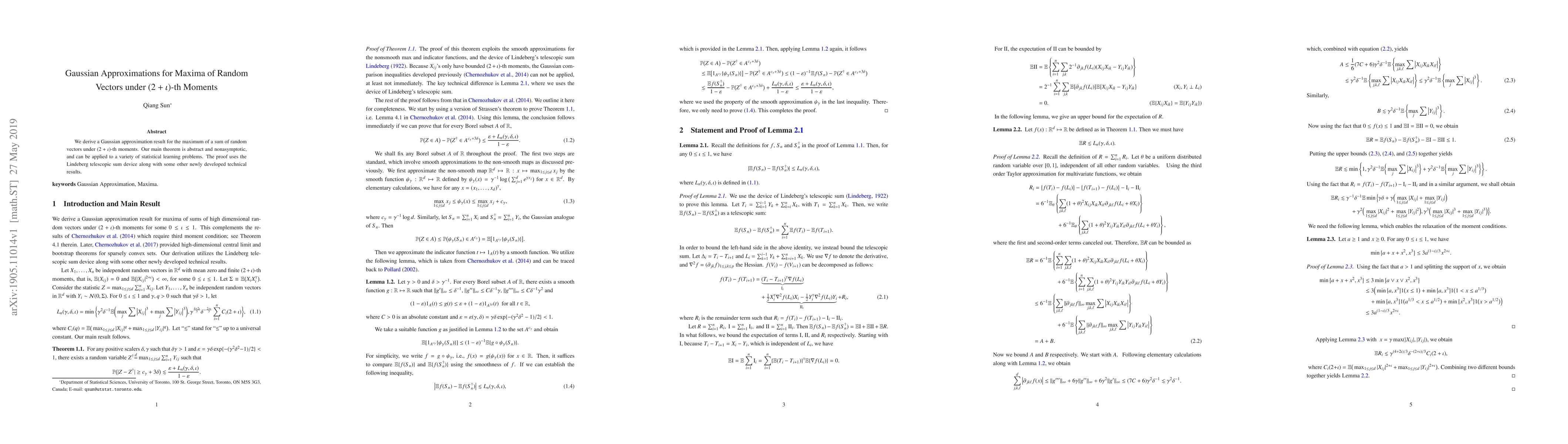We derive a Gaussian approximation result for the maximum of a sum of random vectors under $(2+\iota)$-th moments. Our main theorem is abstract and nonasymptotic, and can be applied to a variety of statistical learning problems. The proof uses the Lindeberg telescopic sum device along with some other newly developed technical results.