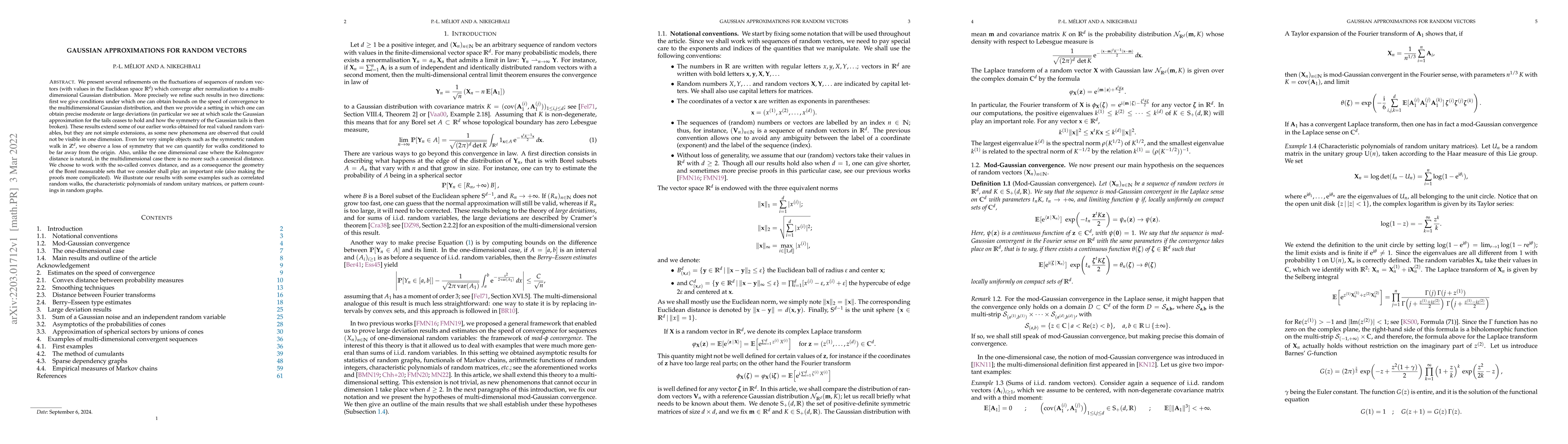 This paper refines Gaussian approximations for sequences of random vectors in $\mathbb{R}^d$, providing bounds on convergence speed and precise moderate/large deviations. It introduces new phenomena, such as symmetry loss in higher dimensions, and uses the convex distance for analysis, illustrating results with examples like correlated random walks and random graphs.