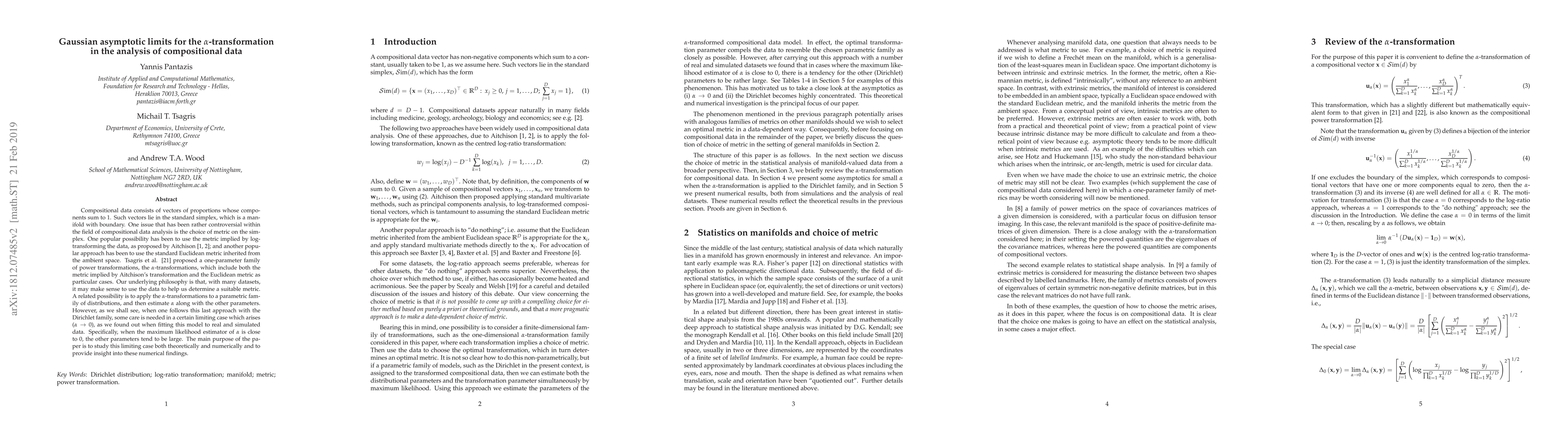 This paper explores the Gaussian asymptotic limits for the $\alpha$-transformation in compositional data analysis, focusing on the choice of metric for the standard simplex. It investigates the behavior of the $\alpha$-transformations when applied to the Dirichlet family, particularly in the limiting case where $\alpha \neq 0$ and the maximum likelihood estimator of $\alpha$ approaches 0, leading to large other parameters. The study provides theoretical and numerical insights into this behavior.