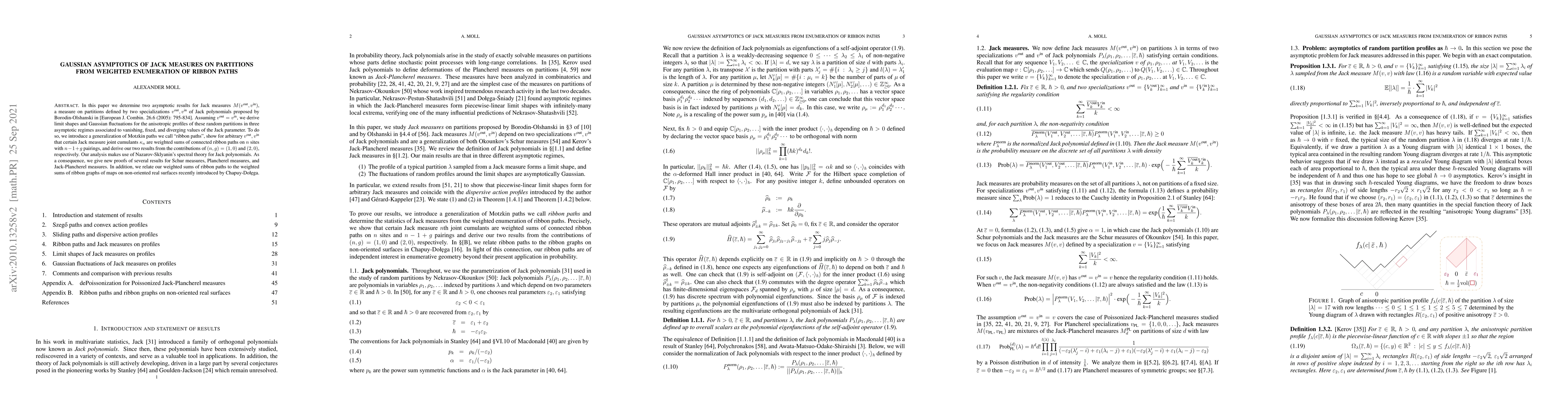 This paper establishes Gaussian asymptotics for Jack measures on partitions, deriving limit shapes and fluctuations in three regimes of the Jack parameter. It introduces ribbon paths, weighted by pairings, to compute joint cumulants, and utilizes Nazarov-Sklyanin's spectral theory to provide new proofs for measures like Schur and Plancherel.