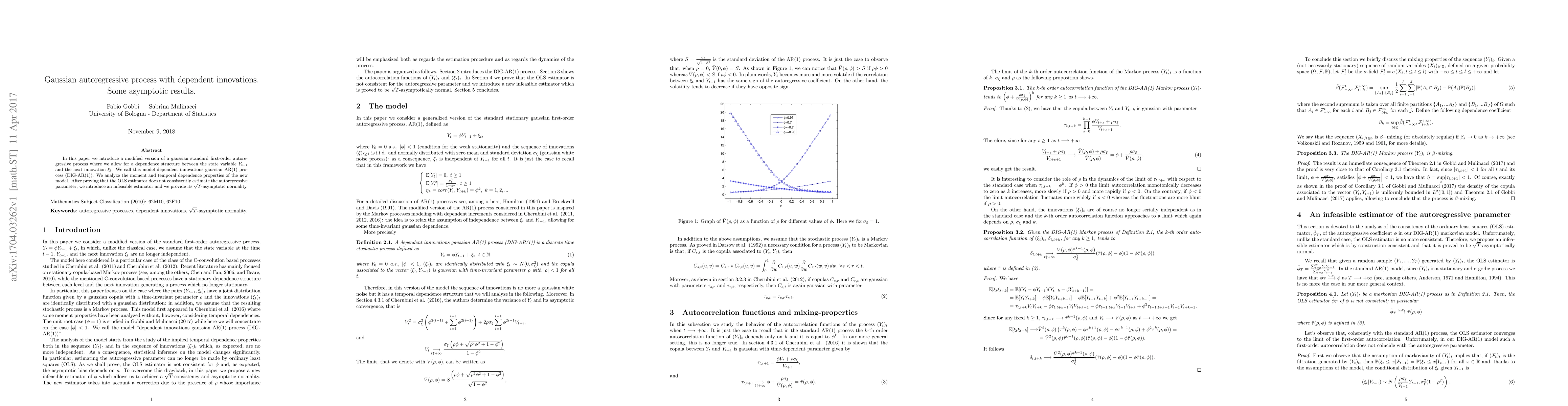 This paper introduces a modified Gaussian AR(1) process with dependent innovations, termed DIG-AR(1), and analyzes its moment and temporal dependence properties. It finds that OLS is inconsistent for estimating the autoregressive parameter, proposing an infeasible estimator with $\sqrt{T}$-asymptotic normality instead.