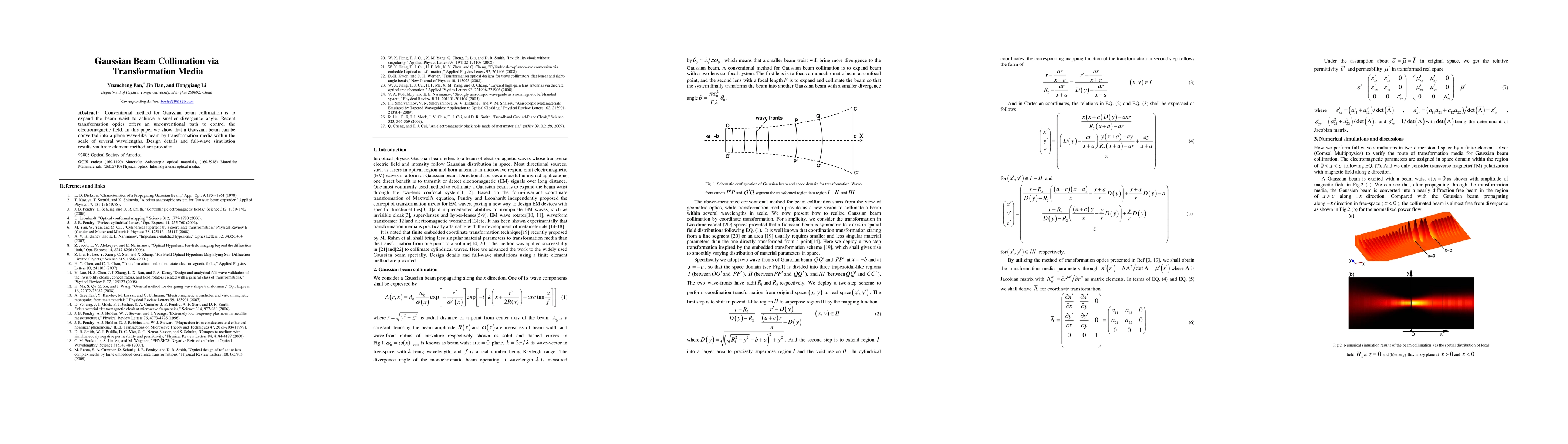 This paper explores the use of transformation media to convert a Gaussian beam into a plane wave-like beam within several wavelengths, offering an unconventional method for Gaussian beam collimation compared to traditional techniques. Simulation results using the finite element method validate the proposed design.