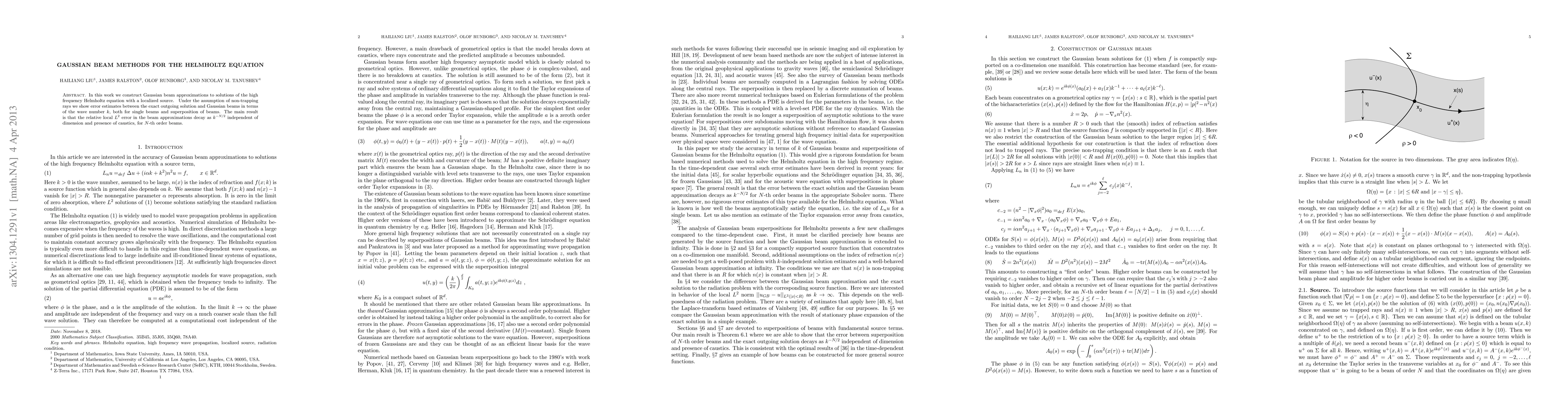 This paper constructs Gaussian beam approximations for high-frequency Helmholtz equations with localized sources, demonstrating error estimates that decay as $k^{-N/2}$ for $N$-th order beams, independent of dimension and caustics, under non-trapping ray assumptions.