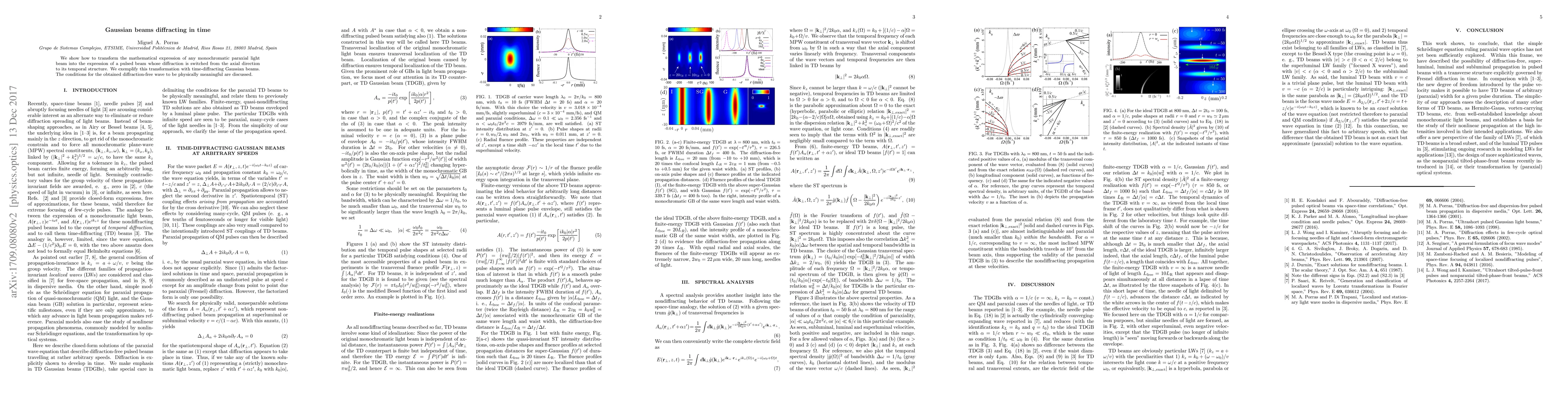 We show how to transform the mathematical expression of any monochromatic paraxial light beam into the expression of a pulsed beam whose diffraction is switched from the axial direction to its temporal structure. We exemplify this transformation with time-diffracting Gaussian beams. The conditions for the obtained diffraction-free wave to be physically meaningful are discussed.