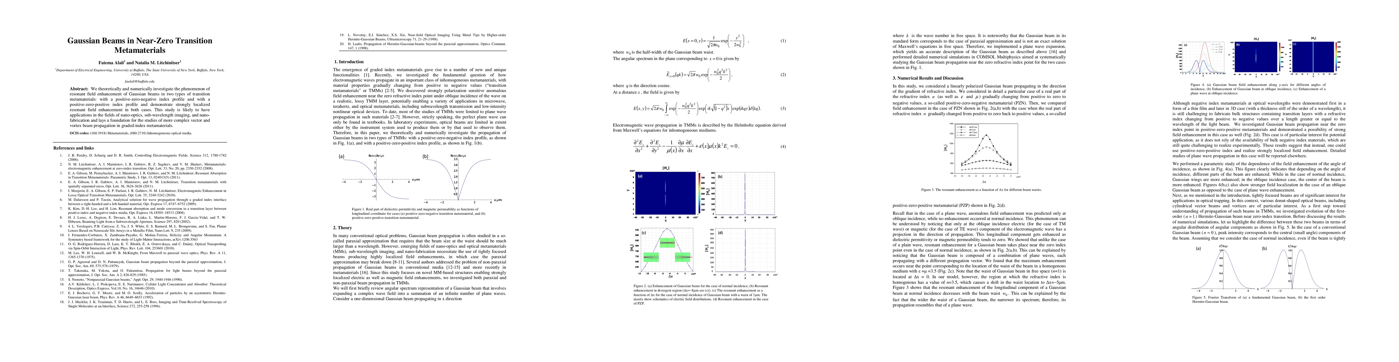 This paper investigates the resonant field enhancement of Gaussian beams in two types of transition metamaterials, demonstrating strongly localized enhancements in both positive-zero-negative and positive-zero-positive index profiles. The findings have potential applications in nano-optics, sub-wavelength imaging, and nano-fabrication.