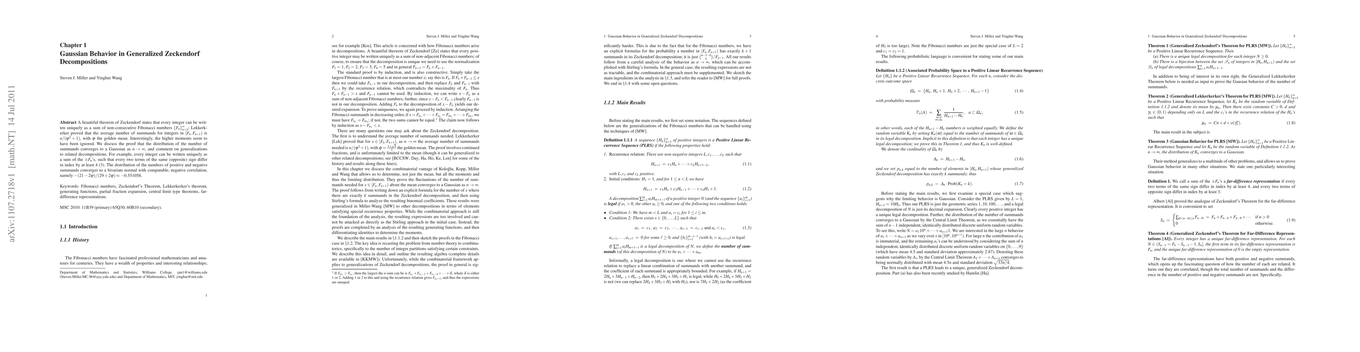 A beautiful theorem of Zeckendorf states that every integer can be written uniquely as a sum of non-consecutive Fibonacci numbers $\{F_n\}_{n=1}^{\infty}$; Lekkerkerker proved that the average number of summands for integers in $[F_n, F_{n+1})$ is $n/(\phi^2 + 1)$, with $\phi$ the golden mean. Interestingly, the higher moments seem to have been ignored. We discuss the proof that the distribution of the number of summands converges to a Gaussian as $n \to \infty$, and comment on generalizations to related decompositions. For example, every integer can be written uniquely as a sum of the $\pm F_n$'s, such that every two terms of the same (opposite) sign differ in index by at least 4 (3). The distribution of the numbers of positive and negative summands converges to a bivariate normal with computable, negative correlation, namely $-(21-2\phi)/(29+2\phi) \approx -0.551058$.