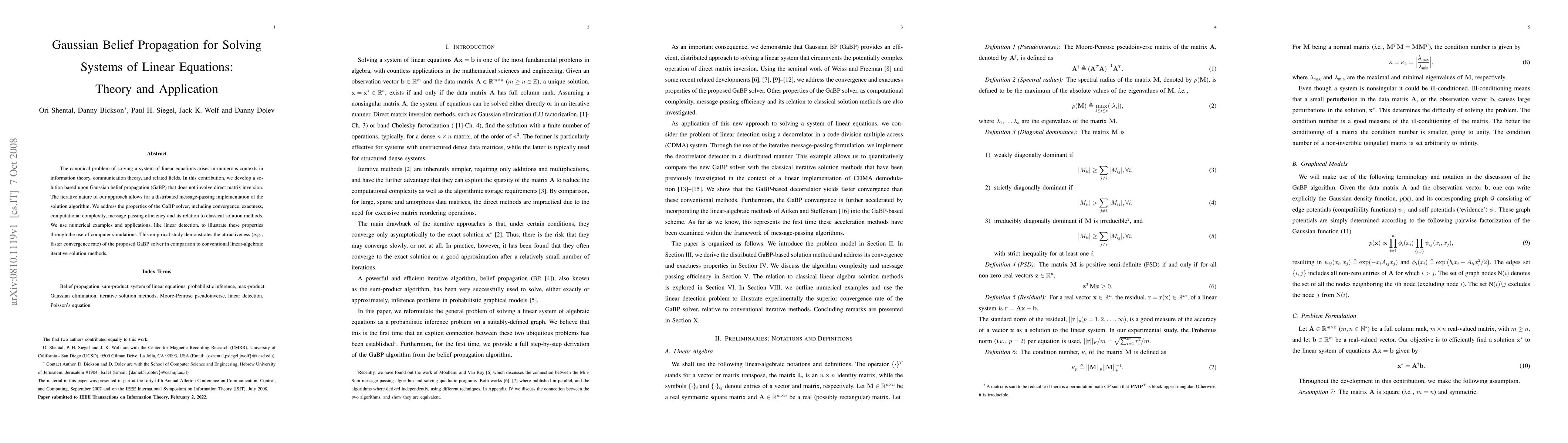 This paper proposes Gaussian belief propagation (GaBP) as an iterative method to solve systems of linear equations without direct matrix inversion, showcasing its distributed implementation, convergence, and efficiency through simulations in applications like linear detection. Empirical results indicate GaBP's faster convergence compared to traditional methods.