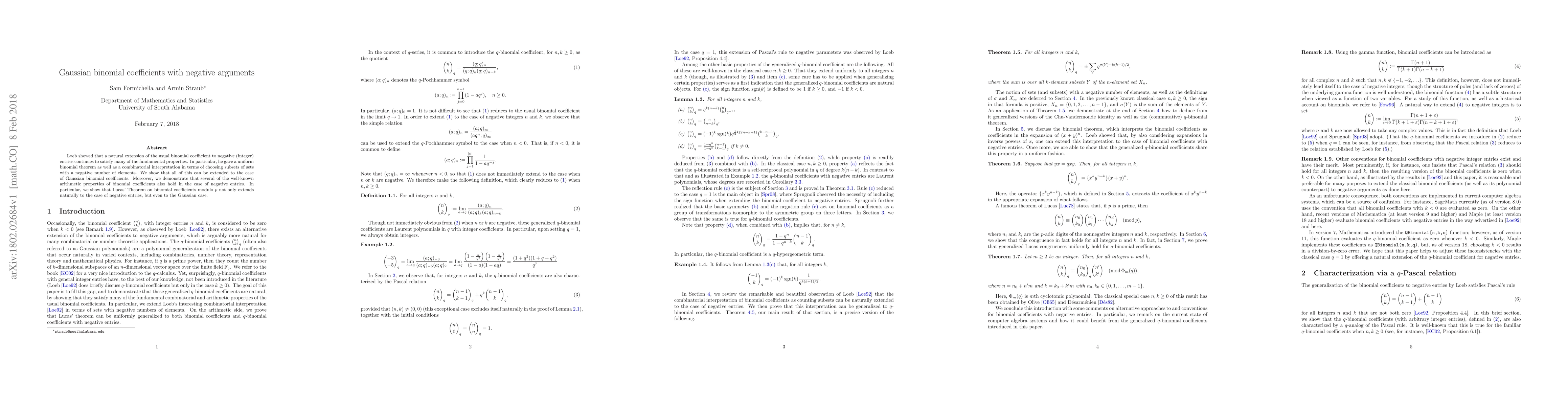 This paper extends Loeb's work on binomial coefficients with negative arguments to Gaussian binomial coefficients, preserving fundamental properties and combinatorial interpretations. It also demonstrates that Lucas' Theorem holds for Gaussian binomial coefficients with negative entries.