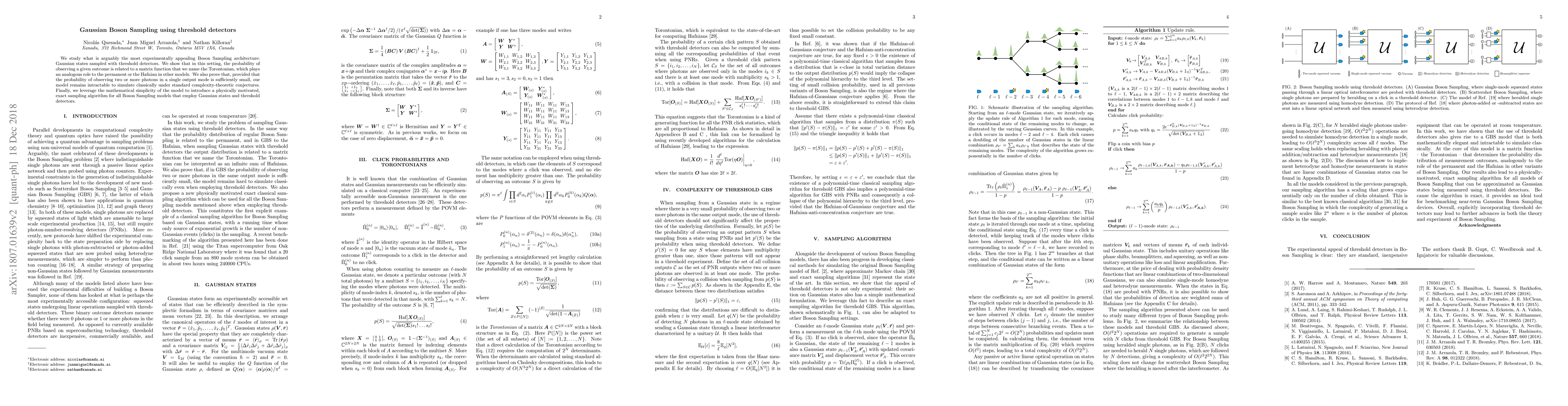 This paper investigates Gaussian Boson Sampling using threshold detectors, introducing the Torontonian as a matrix function analogous to the permanent or Hafnian. It demonstrates that the model remains intractable to simulate classically if the probability of multi-photon events is low, and presents an exact sampling algorithm for this architecture.