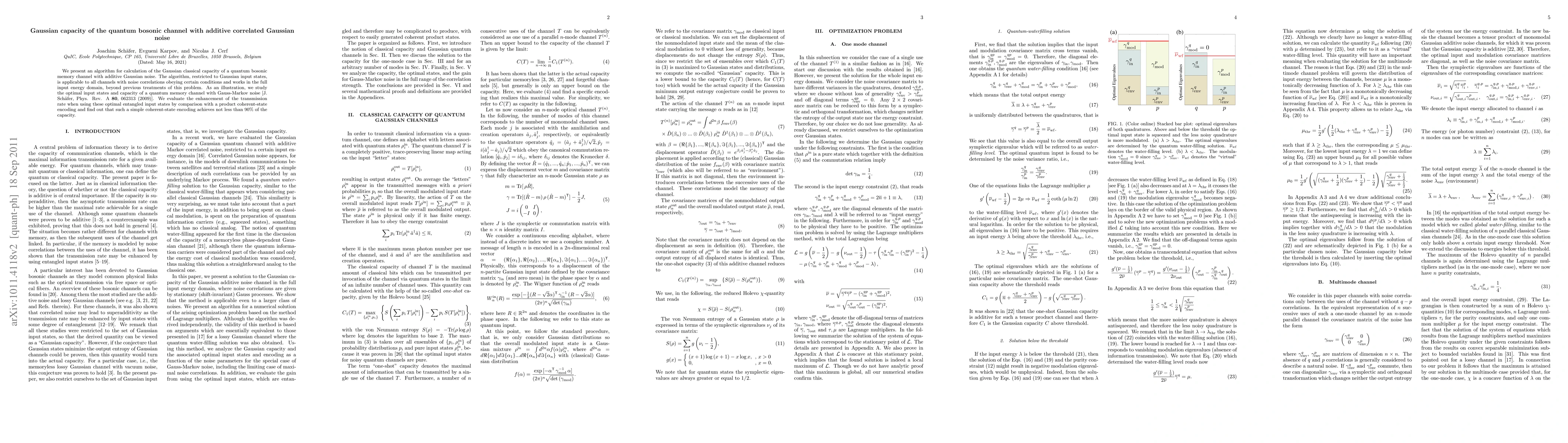 This paper presents an algorithm for calculating the Gaussian classical capacity of quantum bosonic channels with additive correlated Gaussian noise, applicable to channels with specific noise correlation conditions. It demonstrates the algorithm's effectiveness by comparing the transmission rate of optimal entangled input states to a simple coherent-state encoding, finding the latter achieves nearly 90% of the capacity.