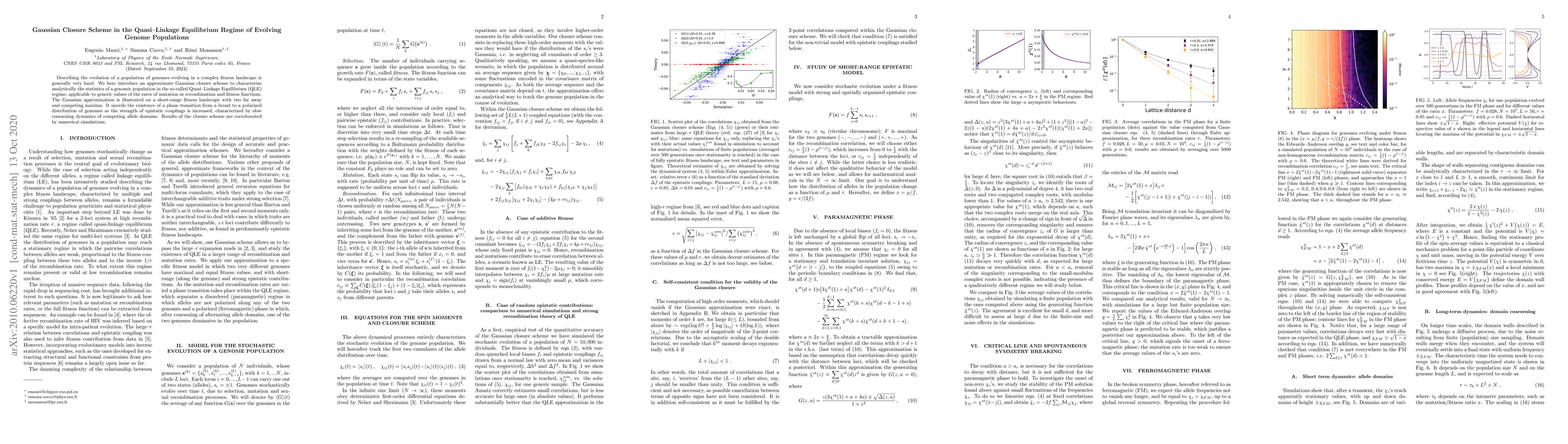 Describing the evolution of a population of genomes evolving in a complex fitness landscape is generally very hard. We here introduce an approximate Gaussian closure scheme to characterize analytically the statistics of a genomic population in the so-called Quasi--Linkage Equilibrium (QLE) regime, applicable to generic values of the rates of mutation or recombination and fitness functions. The Gaussian approximation is illustrated on a short-range fitness landscape with two far away and competing maxima. It unveils the existence of a phase transition from a broad to a polarized distribution of genomes as the strength of epistatic couplings is increased, characterized by slow coarsening dynamics of competing allele domains. Results of the closure scheme are corroborated by numerical simulations.