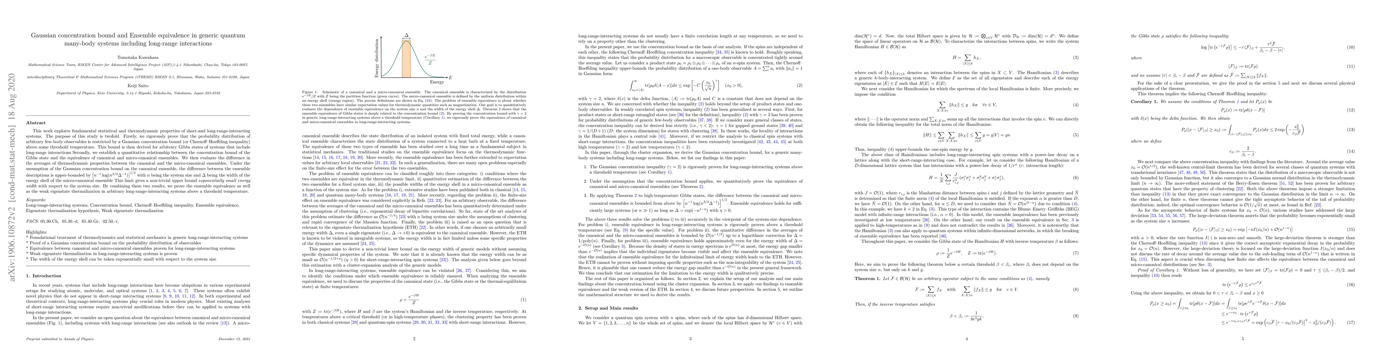 This work explores fundamental statistical and thermodynamic properties of short-and long-range-interacting systems. The purpose of this study is twofold. Firstly, we rigorously prove that the probability distribution of arbitrary few-body observables is restricted by a Gaussian concentration bound (or Chernoff--Hoeffding inequality) above some threshold temperature. This bound is then derived for arbitrary Gibbs states of systems that include long-range interactions Secondly, we establish a quantitative relationship between the concentration bound of the Gibbs state and the equivalence of canonical and micro-canonical ensembles. We then evaluate the difference in the averages of thermodynamic properties between the canonical and the micro-canonical ensembles. Under the assumption of the Gaussian concentration bound on the canonical ensemble, the difference between the ensemble descriptions is upper-bounded by $\left[n^{-1} \log (n^{3/2}\Delta^{-1})\right]^{1/2}$ with $n$ being the system size and $\Delta$ being the width of the energy shell of the micro-canonical ensemble This limit gives a non-trivial upper bound \textit{exponentially small energy width} with respect to the system size. By combining these two results, we prove the ensemble equivalence as well as the weak eigenstate thermalization in arbitrary long-range-interacting systems above a threshold temperature.