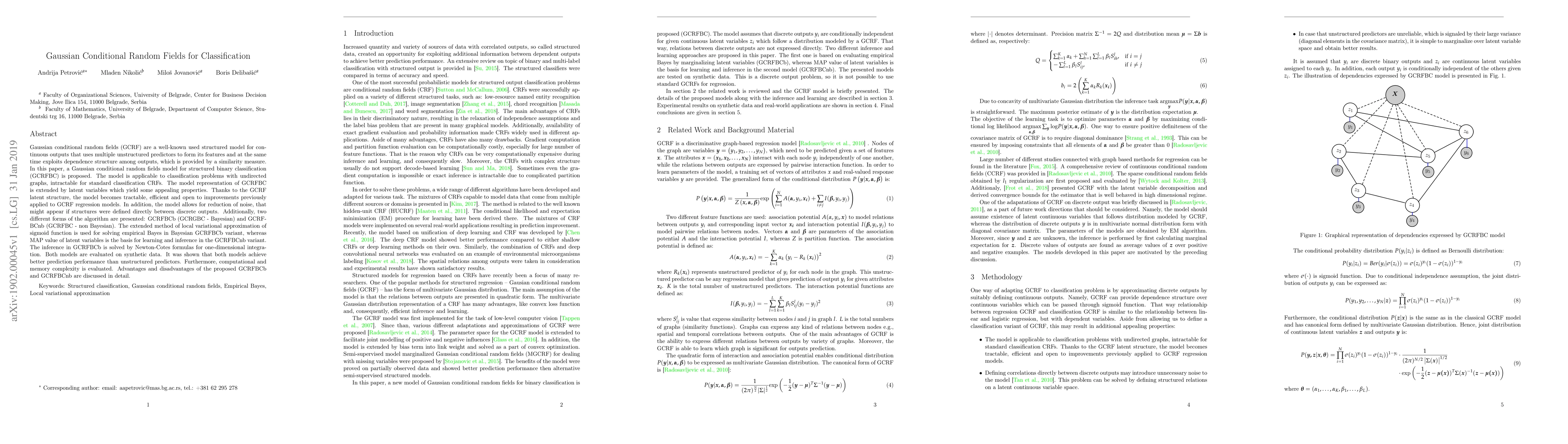 This paper proposes Gaussian Conditional Random Fields for Binary Classification (GCRFBC), extending Gaussian Conditional Random Fields (GCRF) with latent variables to handle intractable structured classification problems efficiently. Two variants, GCRFBCb (Bayesian) and GCRFBCnb (non-Bayesian), are derived using different forms of inference and learning procedures.