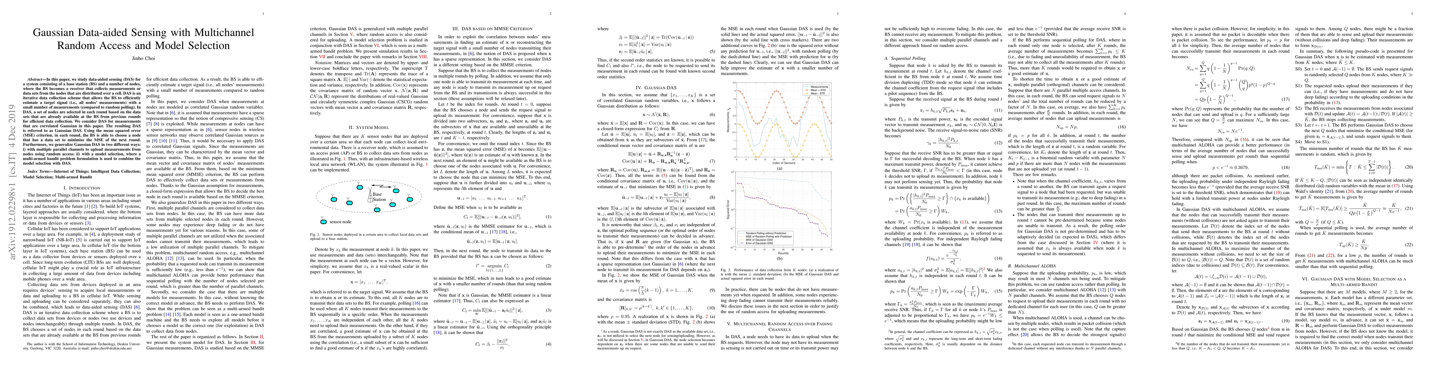 This paper explores Gaussian data-aided sensing (DAS) for a base station collecting correlated Gaussian measurements from distributed nodes. It introduces an iterative scheme to minimize mean squared error and extends DAS to include multichannel random access and model selection using a multi-armed bandit approach.