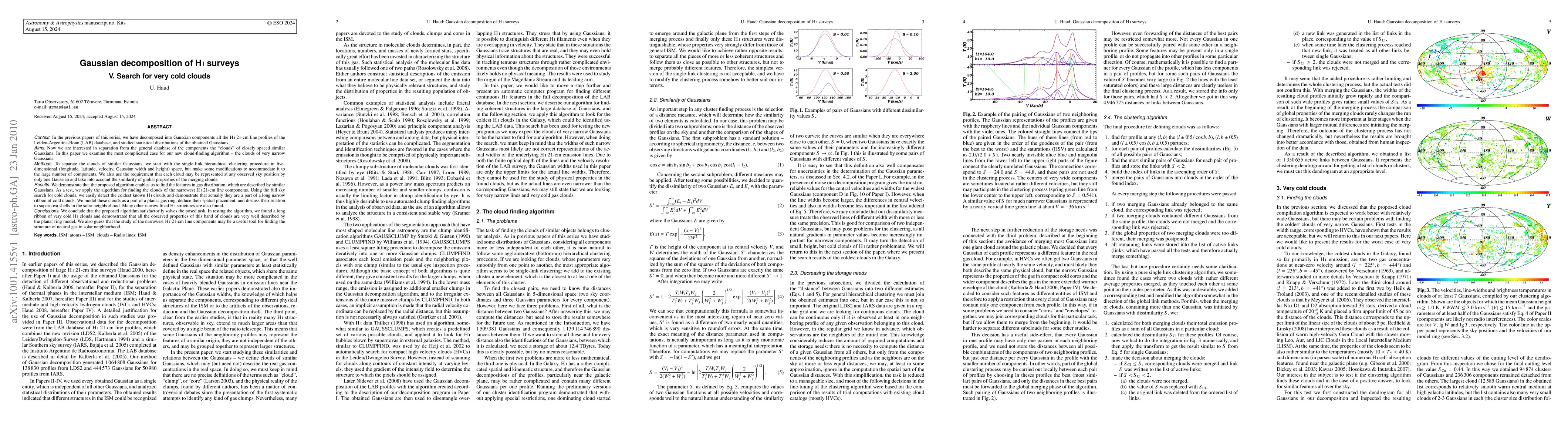 In the previous papers of this series, we have decomposed into Gaussian components all the HI 21-cm line profiles of the Leiden-Argentina-Bonn (LAB) database, and studied statistical distributions of the obtained Gaussians. Now we are interested in separation from the general database of the components the "clouds" of closely spaced similar Gaussians. In this paper we describe the new cloud-finding algorithm. To separate the clouds of similar Gaussians, we start with the single-link hierarchical clustering procedure in five-dimensional (longitude, latitude, velocity, Gaussian width and height) space, but make some modifications to accommodate it to the large number of components. We also use the requirement that each cloud may be represented at any observed sky position by only one Gaussian and take into account the similarity of global properties of the merging clouds. As a test, we apply the algorithm for finding the clouds of the narrowest HI 21-cm line components. Using the full sky search for cold clouds, we easily detect the coldest known HI clouds and demonstrate that actually they are a part of a long narrow ribbon of cold clouds. We model these clouds as a part of a planar gas ring, deduce their spatial placement, and discuss their relation to supernova shells in the solar neighborhood. We conclude that the proposed algorithm satisfactorily solves the posed task. We guess that the study of the narrowest HI 21-cm line components may be a useful tool for finding the structure of neutral gas in solar neighborhood.