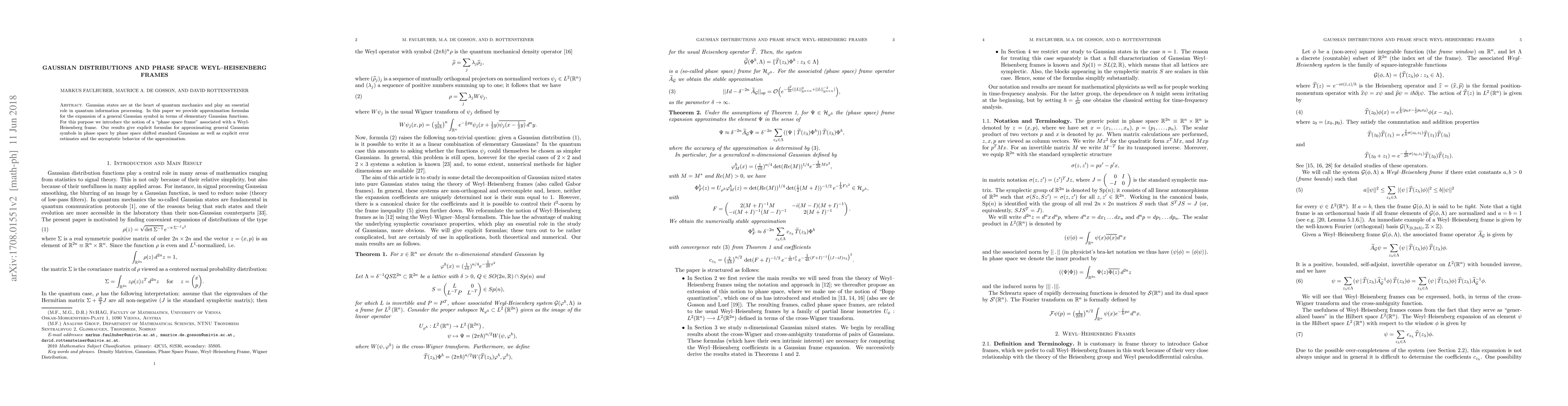 Gaussian states are at the heart of quantum mechanics and play an essential role in quantum information processing. In this paper we provide approximation formulas for the expansion of a general Gaussian symbol in terms of elementary Gaussian functions. For this purpose we introduce the notion of a "phase space frame" associated with a Weyl-Heisenberg frame. Our results give explicit formulas for approximating general Gaussian symbols in phase space by phase space shifted standard Gaussians as well as explicit error estimates and the asymptotic behavior of the approximation.