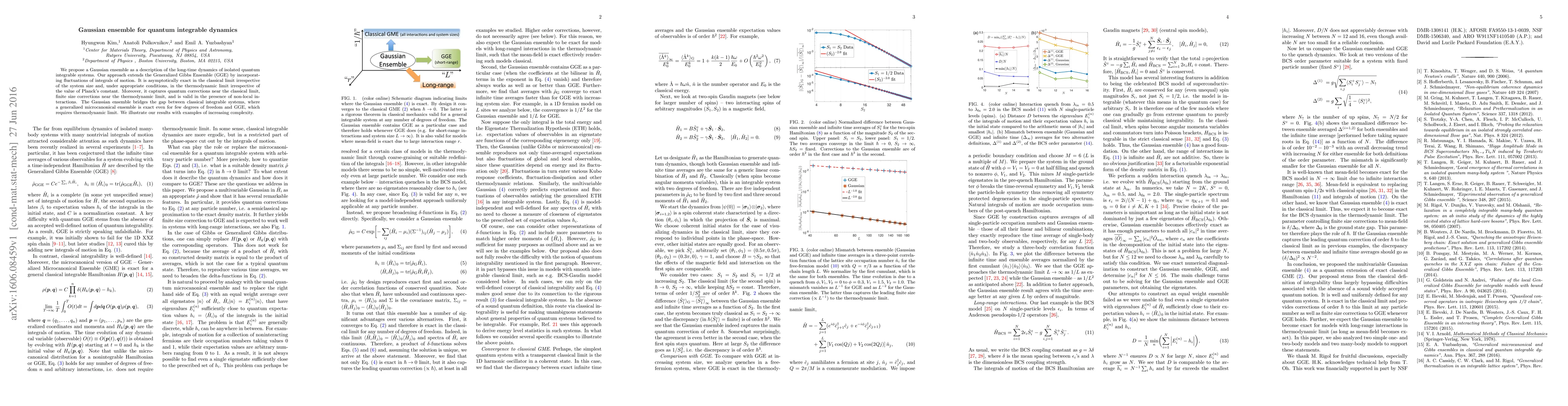 The paper proposes a Gaussian ensemble to describe the long-time dynamics of quantum integrable systems, extending the Generalized Gibbs Ensemble to include fluctuations of integrals of motion. It is asymptotically exact in the classical limit and captures quantum corrections, finite size effects, and non-local interactions.