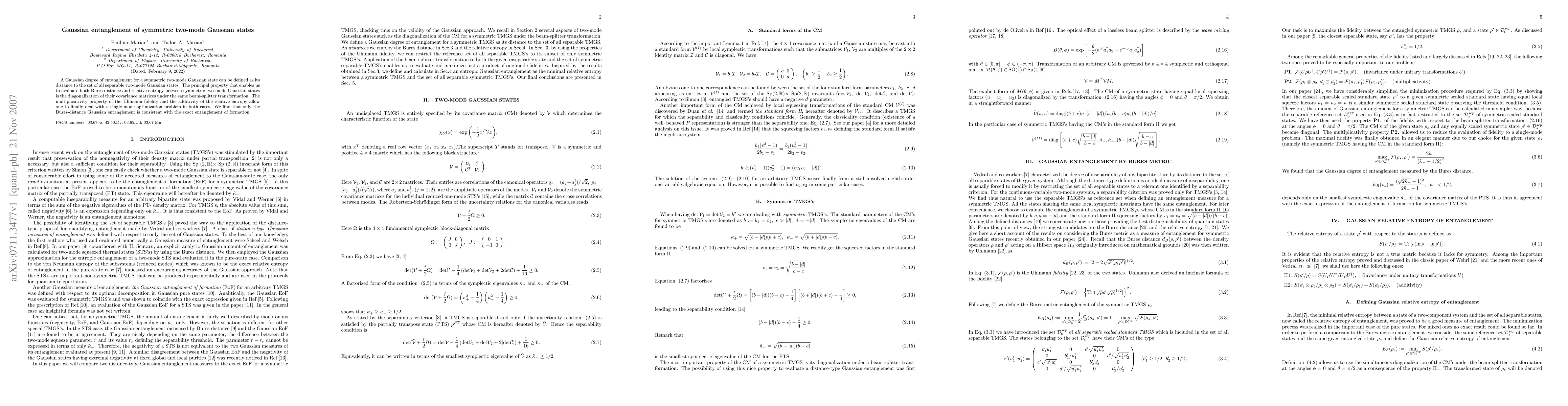 The paper presents a method to evaluate Gaussian entanglement using Bures distance and relative entropy for symmetric two-mode Gaussian states, leveraging the properties of Uhlmann fidelity and relative entropy additivity.