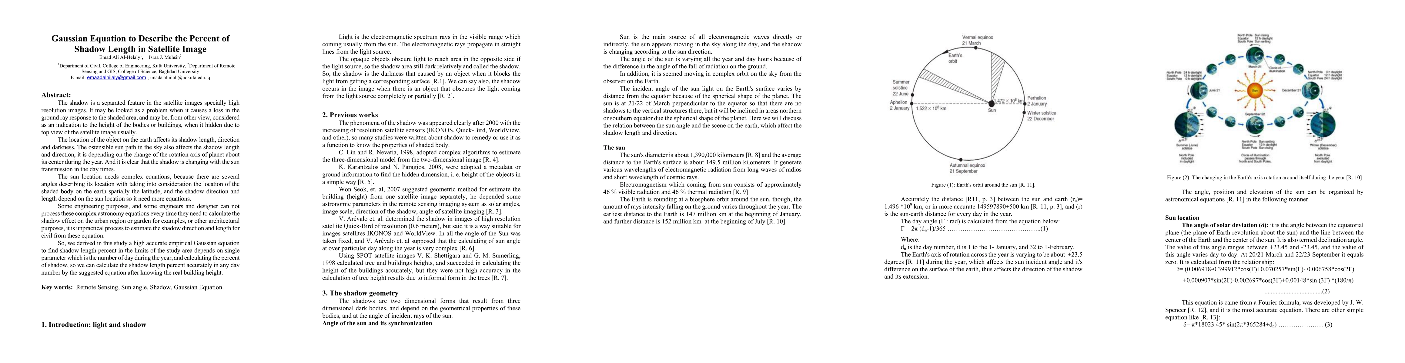 The shadow is a separated feature in the satellite images specially high resolution images. It may be looked as a problem when it causes a loss in the ground ray response to the shaded area, and may be, from other view, considered as an indication to the height of the bodies or buildings, when it hidden due to top view of the satellite image usually. The location of the object on the earth affects its shadow length, direction and darkness. The ostensible sun path in the sky also affects the shadow length and direction, it is depending on the change of the rotation axis of planet about its center during the year. And it is clear that the shadow is changing with the sun transmission in the day times. The sun location needs complex equations, because there are several angles describing its location with taking into consideration the location of the shaded body on the earth spatially the latitude, and the shadow direction and length depend on the sun location so it need more equations. Some engineering purposes, and some engineers and designer can not process these complex astronomy equations every time they need to calculate the shadow effect on the urban region or garden for examples, or other architectural purposes, it is unpractical process to estimate the shadow direction and length for civil from these equation. So, we derived in this study a high accurate empirical Gaussian equation to find shadow length percent in the limits of the study area depends on single parameter which is the number of day during the year, and calculating the percent of shadow, so we can calculate the shadow length percent accurately in any day number by the suggested equation after knowing the real building height.