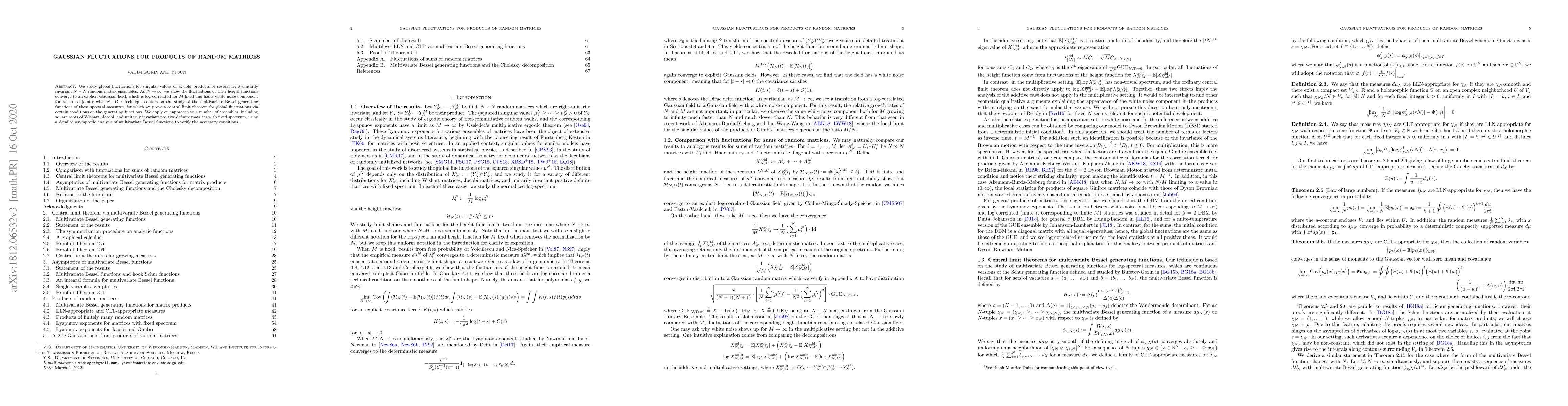 This paper investigates the global fluctuations of singular values in $M$-fold products of large $N \times N$ random matrices, showing their height functions converge to a Gaussian field as $N \to \infty$. The study employs a central limit theorem for multivariate Bessel generating functions and applies the method to various ensembles, including Wishart, Jacobi, and unitarily invariant positive definite matrices.